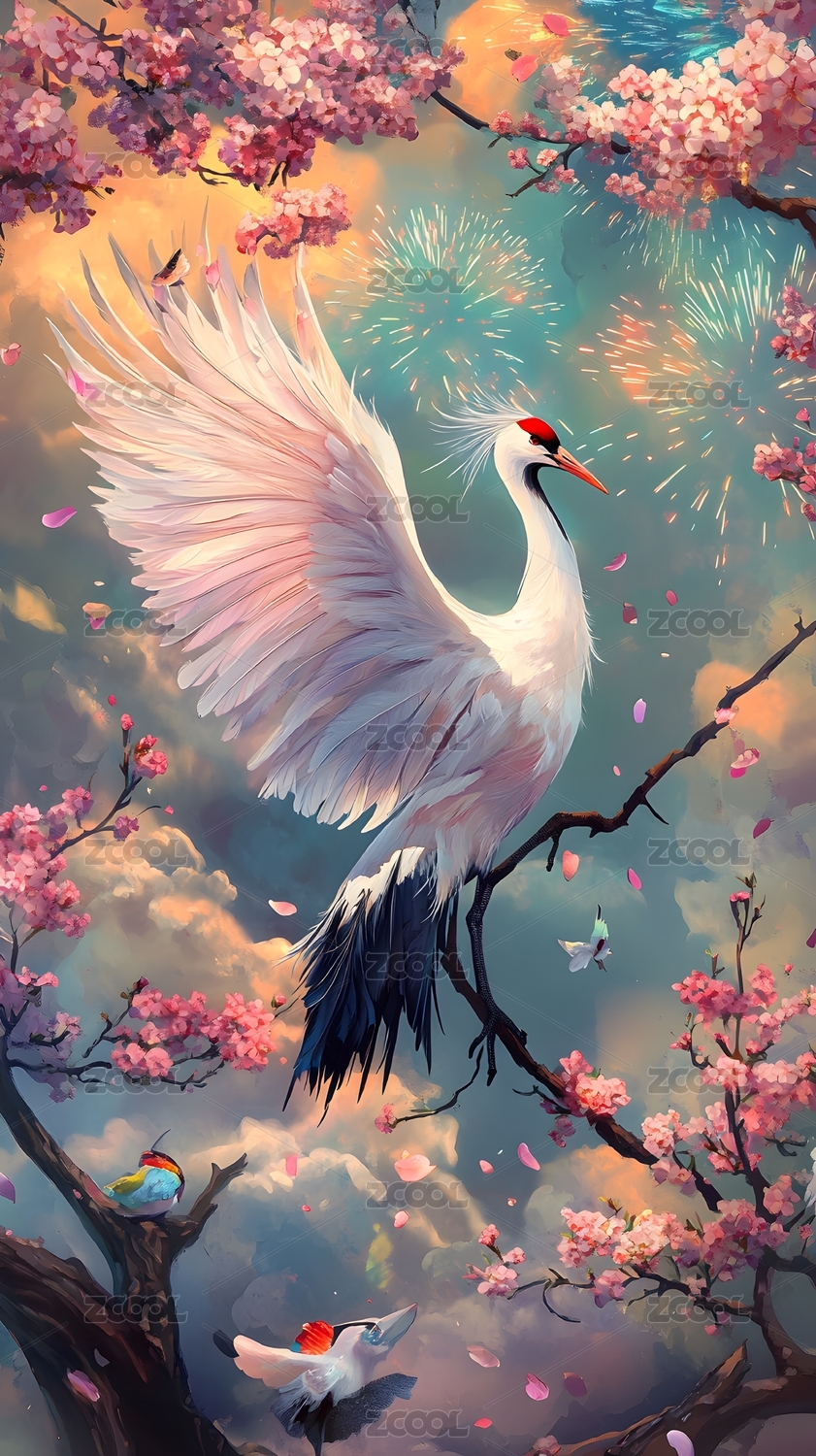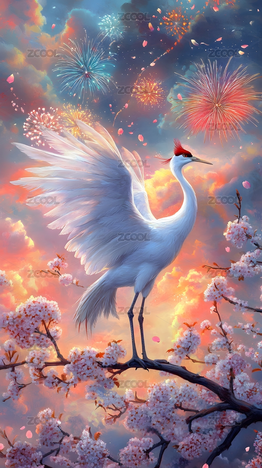 图像,国风,国潮风,中国文化,焰火,丹顶鹤,可爱的,商务,AIGC技术,唯美
