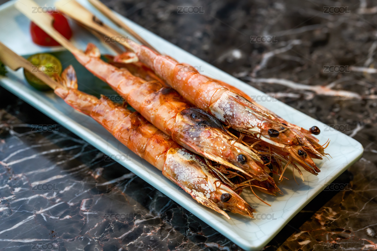 黑色圆盘装炸虾天妇罗摆盘特写放桌子上