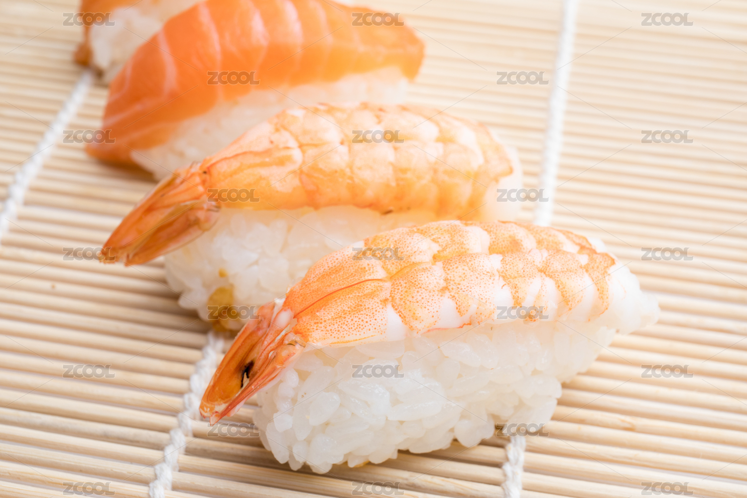 寿司帘上美味的玻璃虾寿司和三文鱼寿司