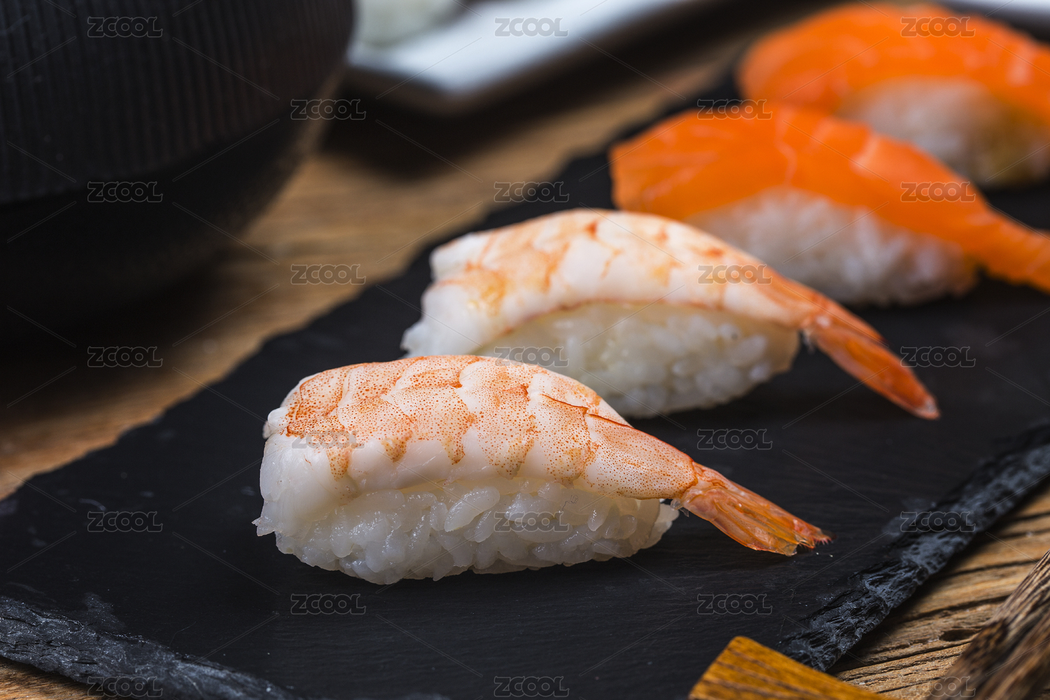 俯拍深色背景上的鲜虾寿司
