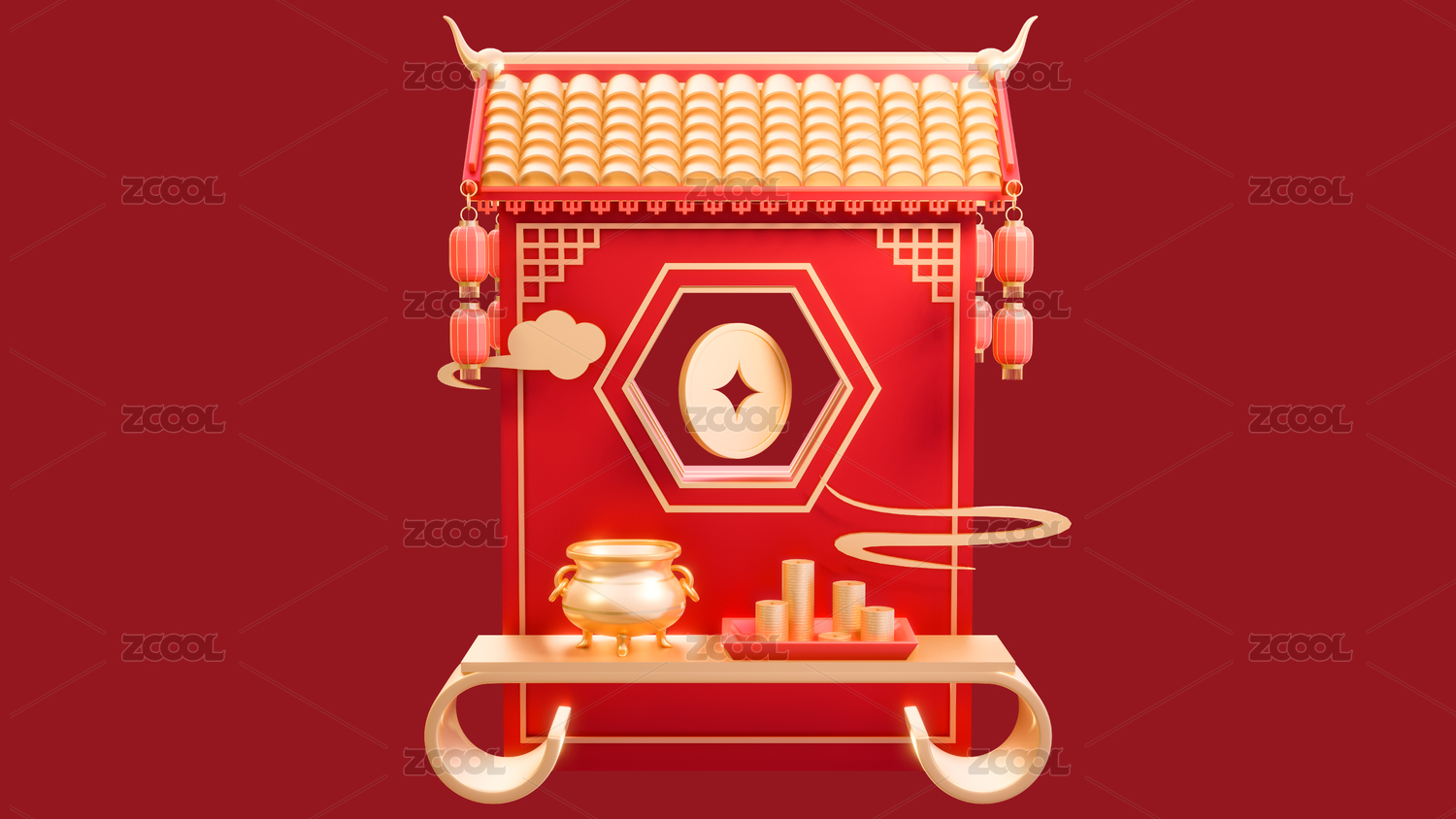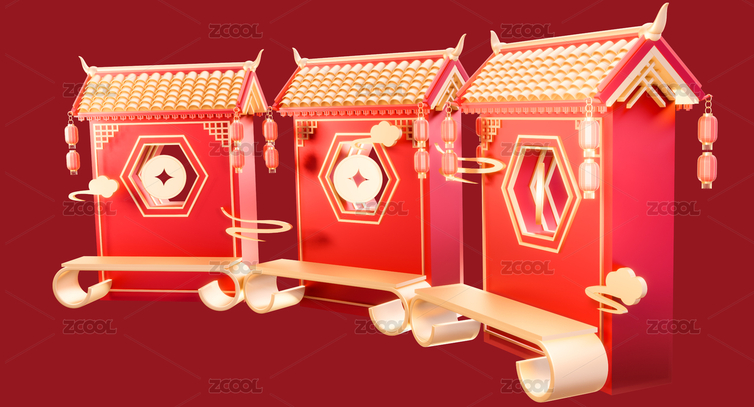 3d中式年货节春节集市摊喜庆场景元素插画