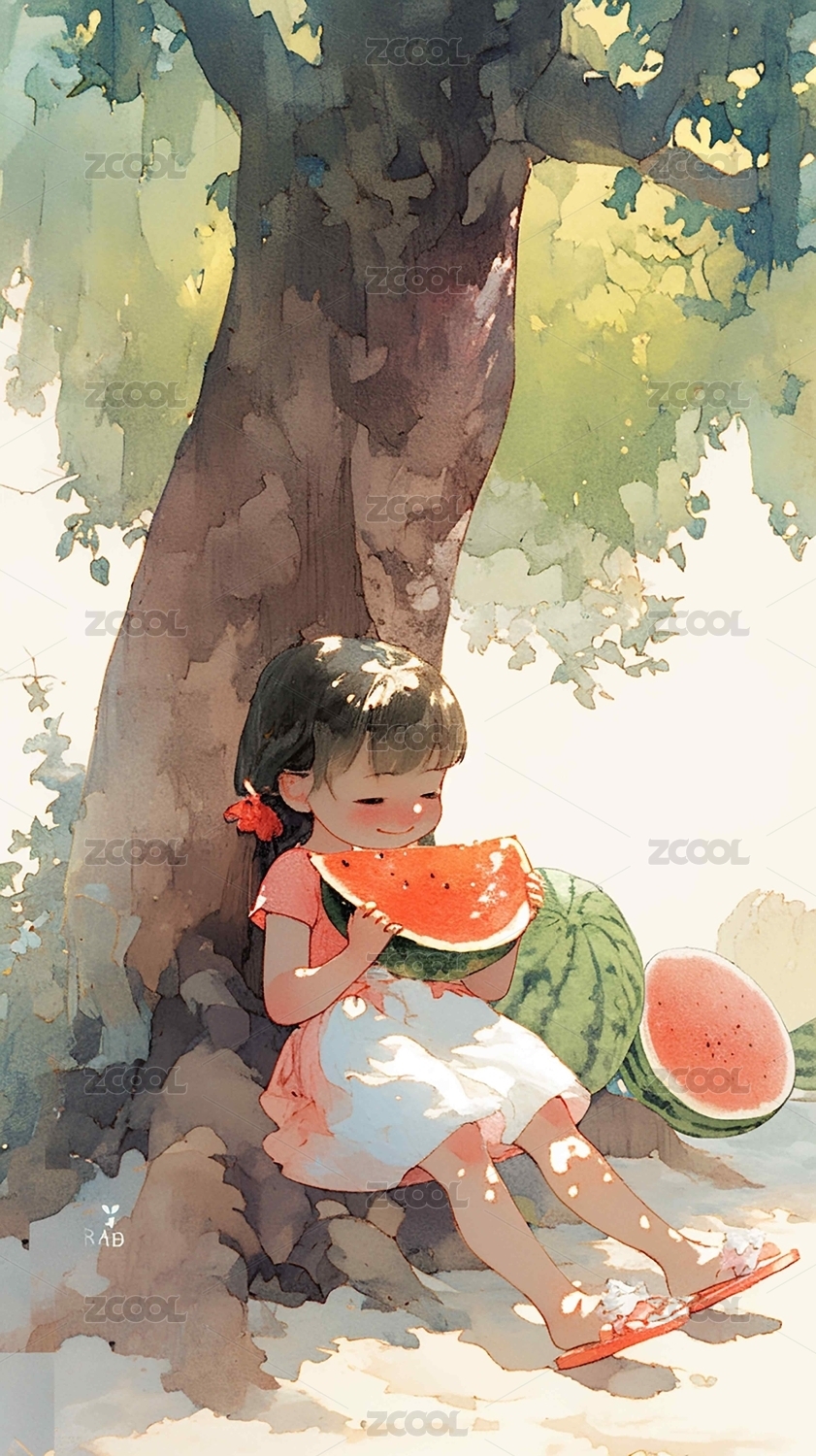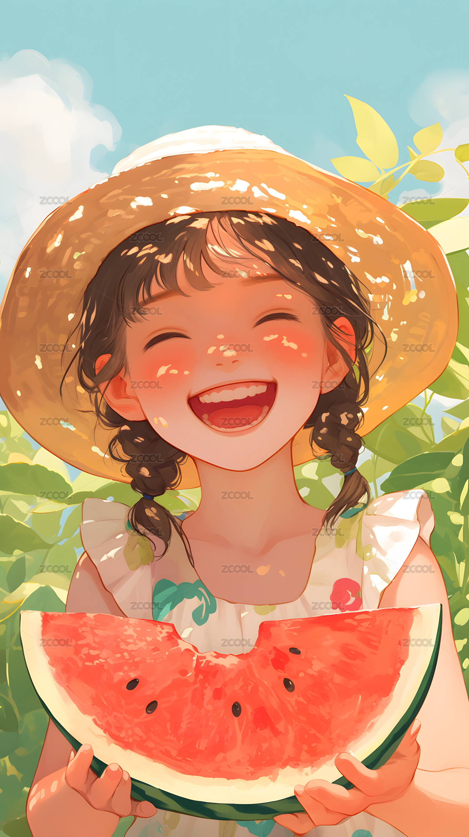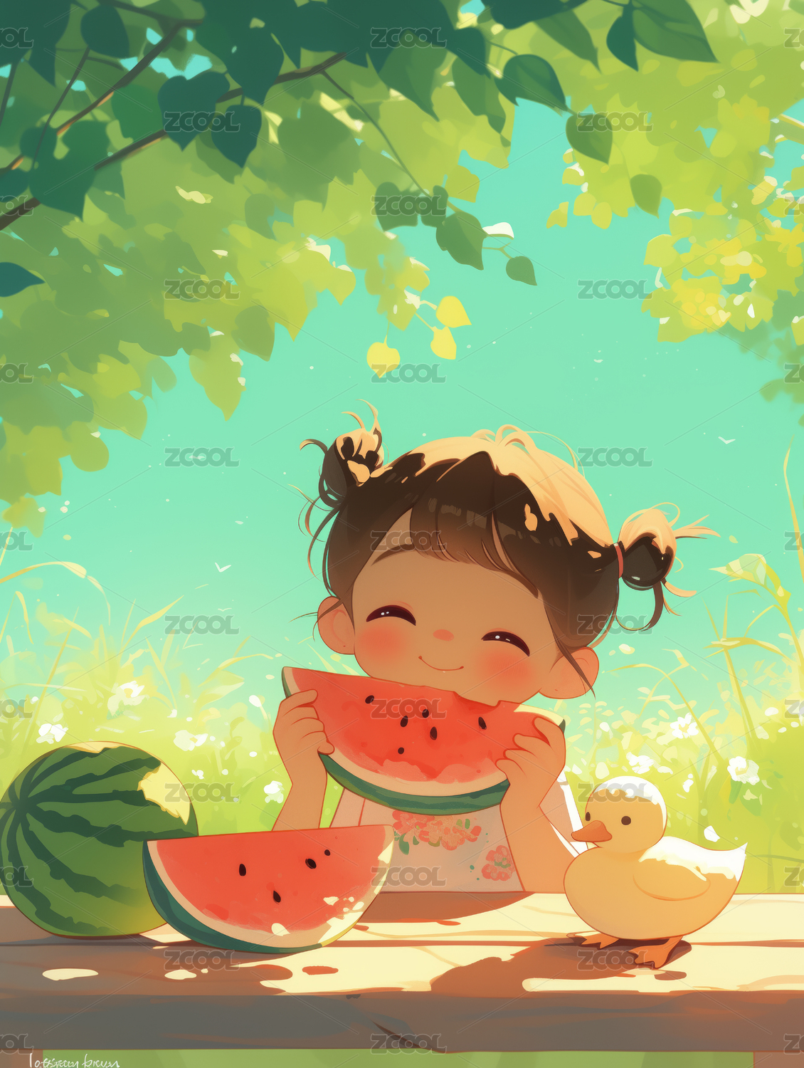 户外亚洲儿童笑着抱着西瓜吃的清新卡通插画