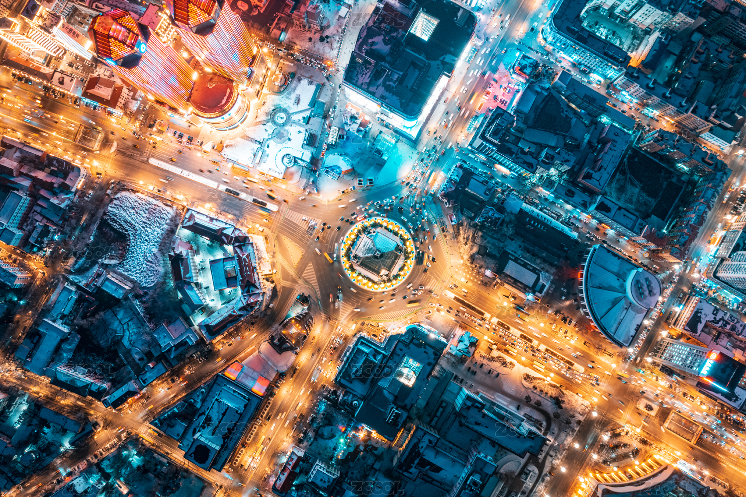中国哈尔滨省博物馆商圈夜景俯瞰航拍