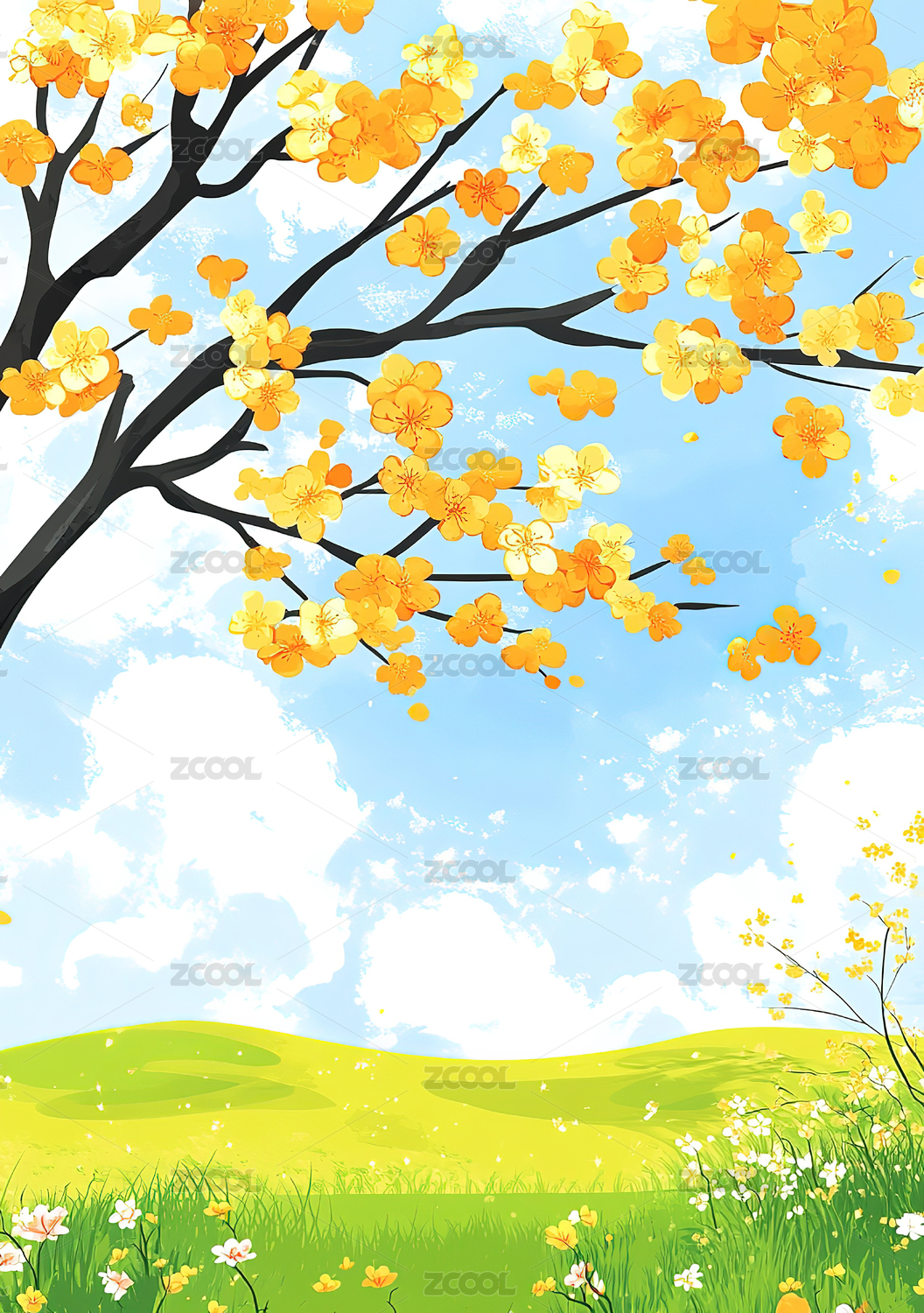 一个穿着黄色斑点裙子的女孩拿着一朵黄色的花飞舞在花丛中