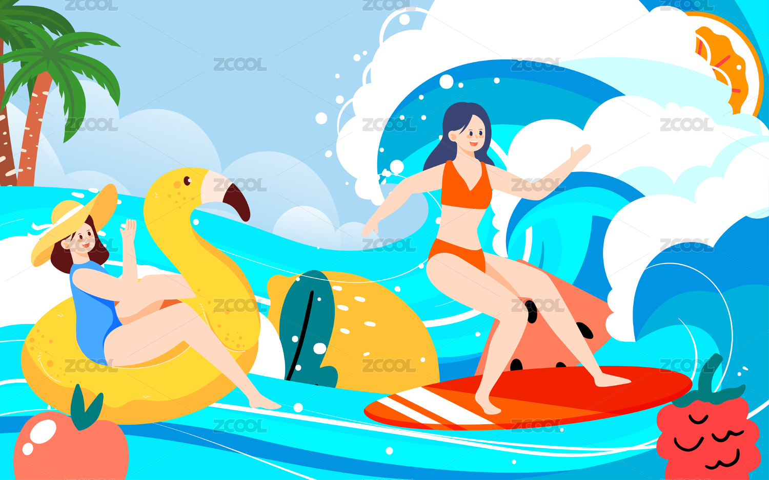 夏天美女海边冲浪插画夏日海滩浪花风景海报