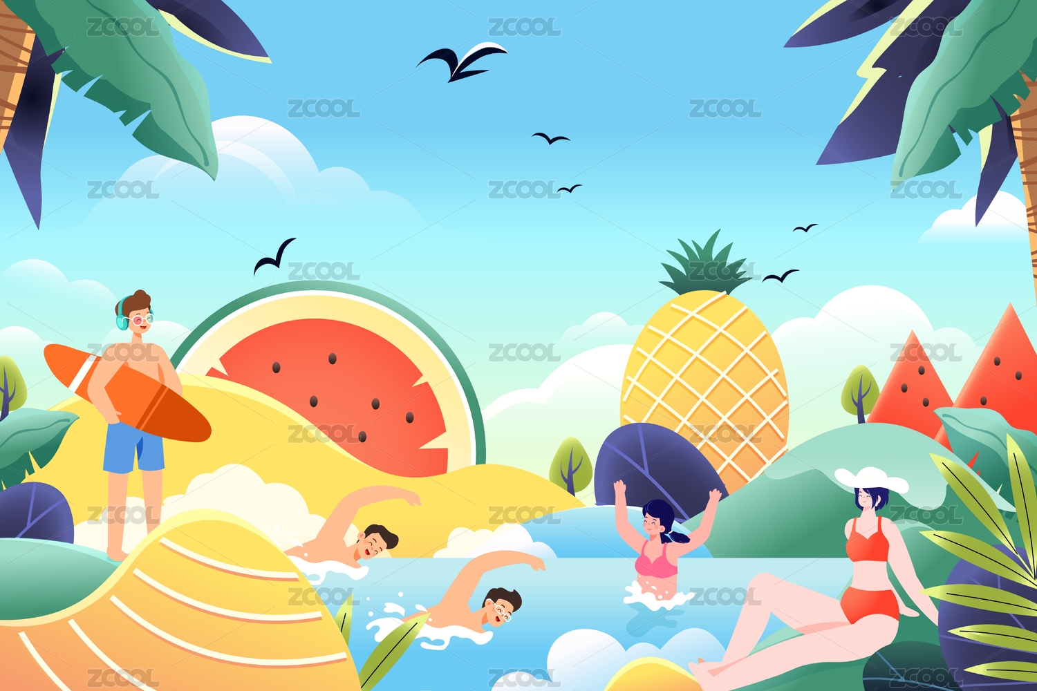 小暑节气人物夏日海滩派对夏天海边游泳插画