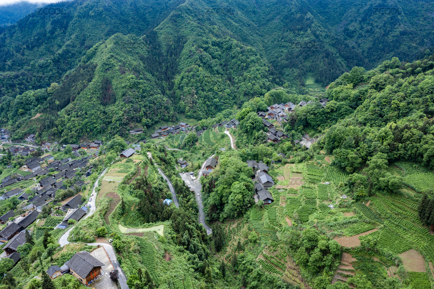 航拍四川青城山积雪的山峰和山谷中的村镇