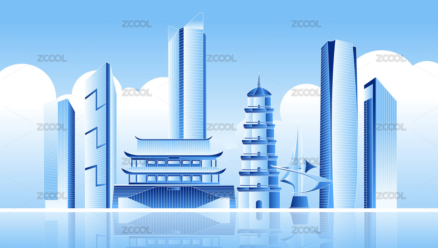 蓝色黄冈城市标志建筑矢量插画