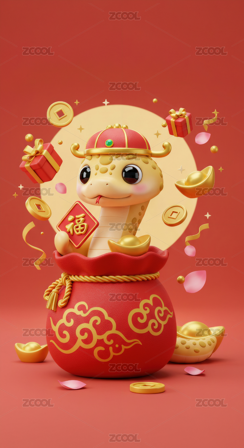 戴狮子头帽的春节蛇年生肖与装满钱的福袋