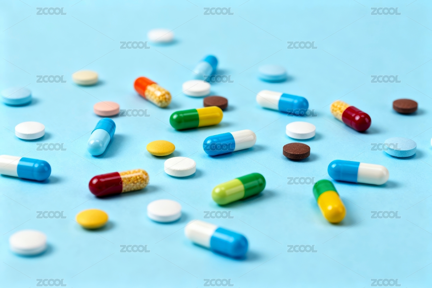 多种药片胶囊与蓝色背景的医药图像