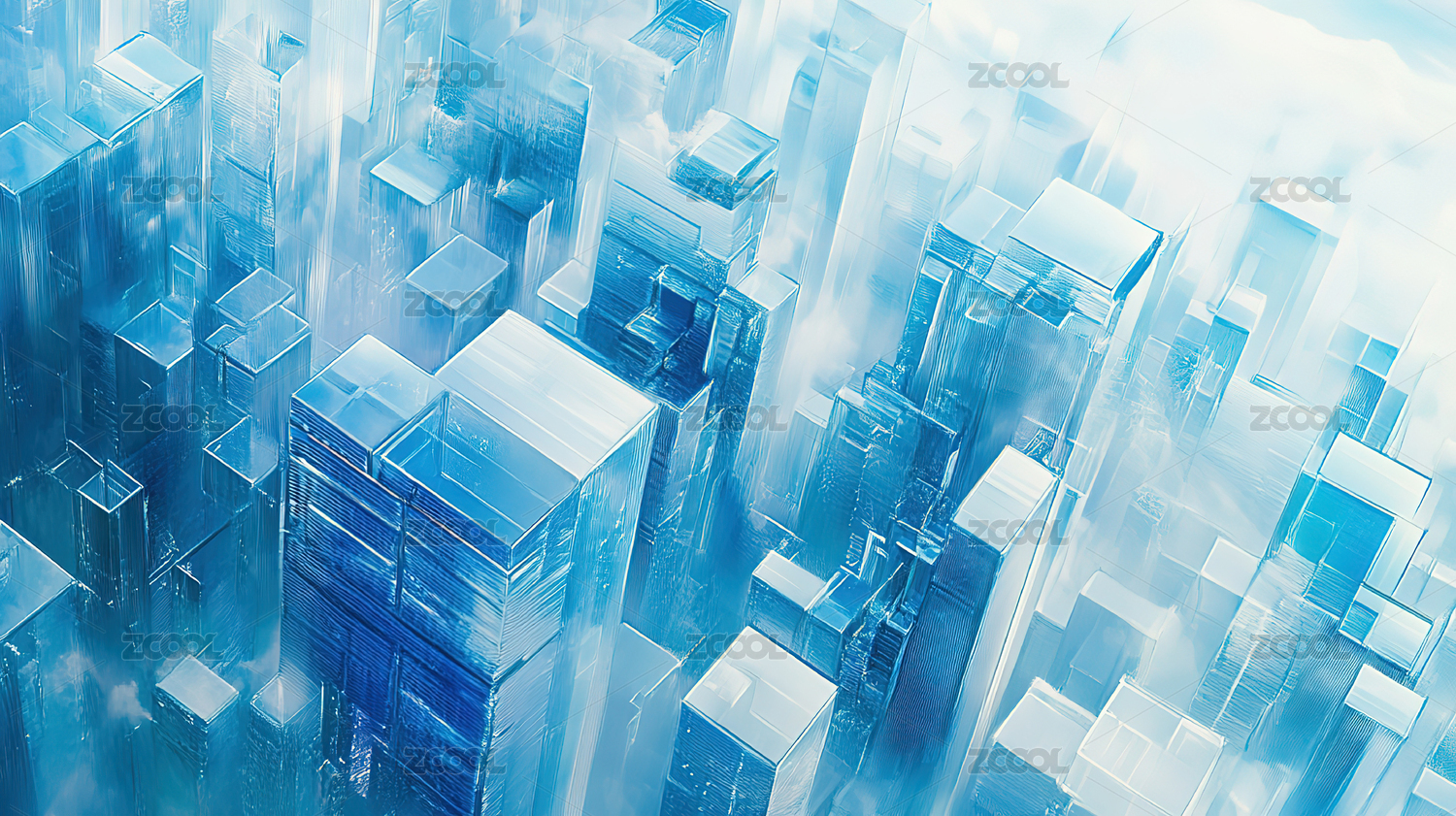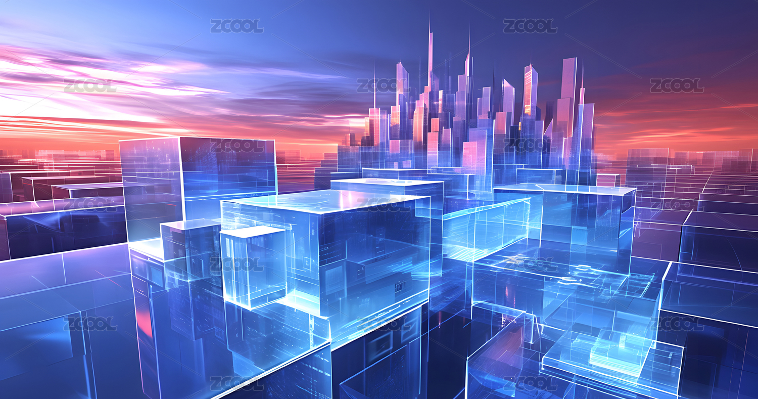 未来主义俯瞰城市景观蓝色霓虹灯和全息数字