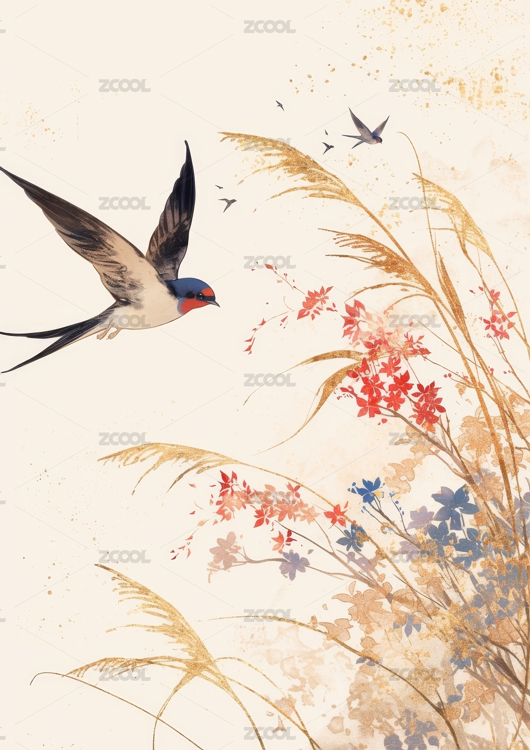 两只鸟飞过花田