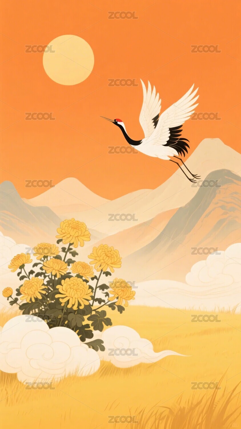 仙鹤菊花秋日山水插画