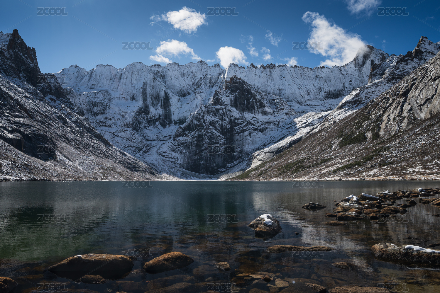 雪山下的深蓝湖泊