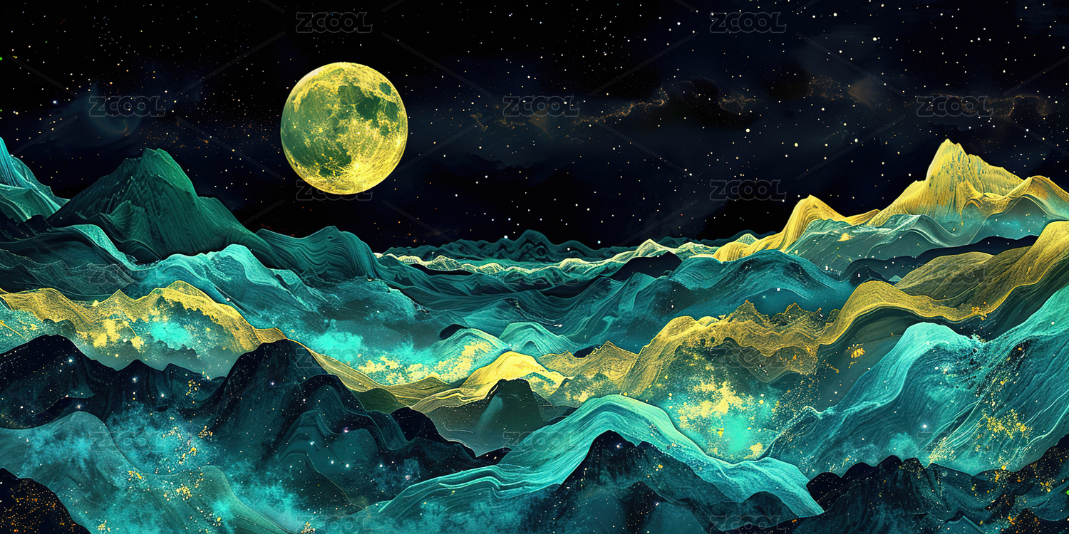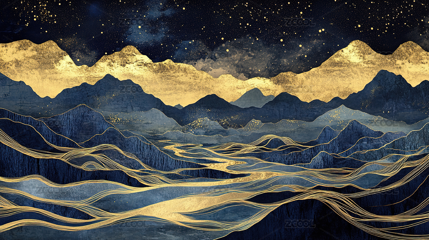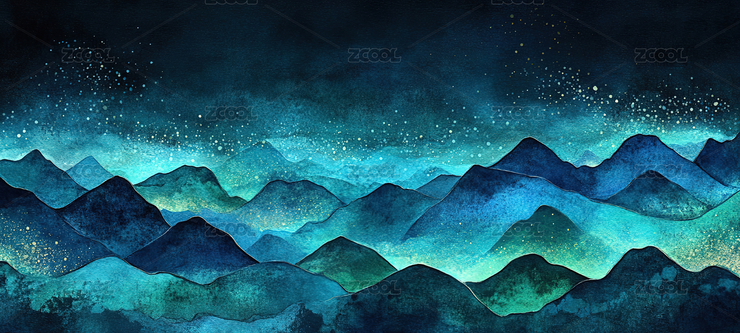 数码艺术描金蓝调日出山水画海报背景