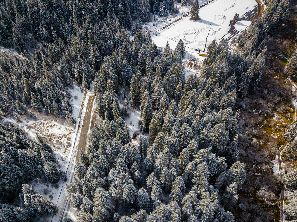 冬天雪中航拍森林里的道路