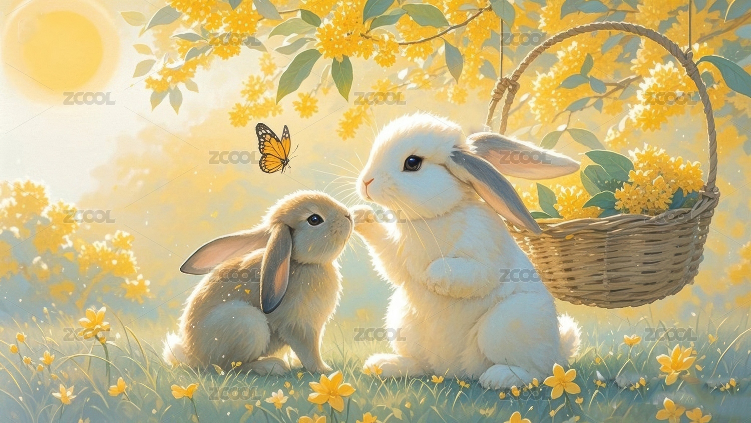 春游,小白兔,可爱,卡通,横构图,兔子,天空,云彩,野餐,草丛
