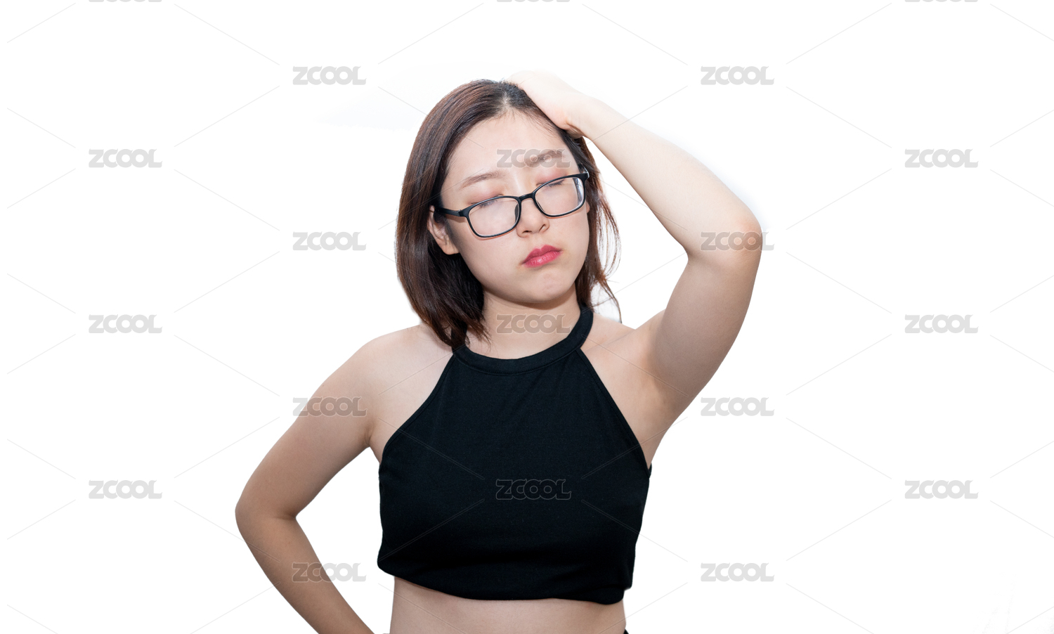 一个熬夜疲惫疲倦劳累的眯着眼的昏昏欲睡的中国美女女孩摸着自己的头表示头晕恶心头疼想休息