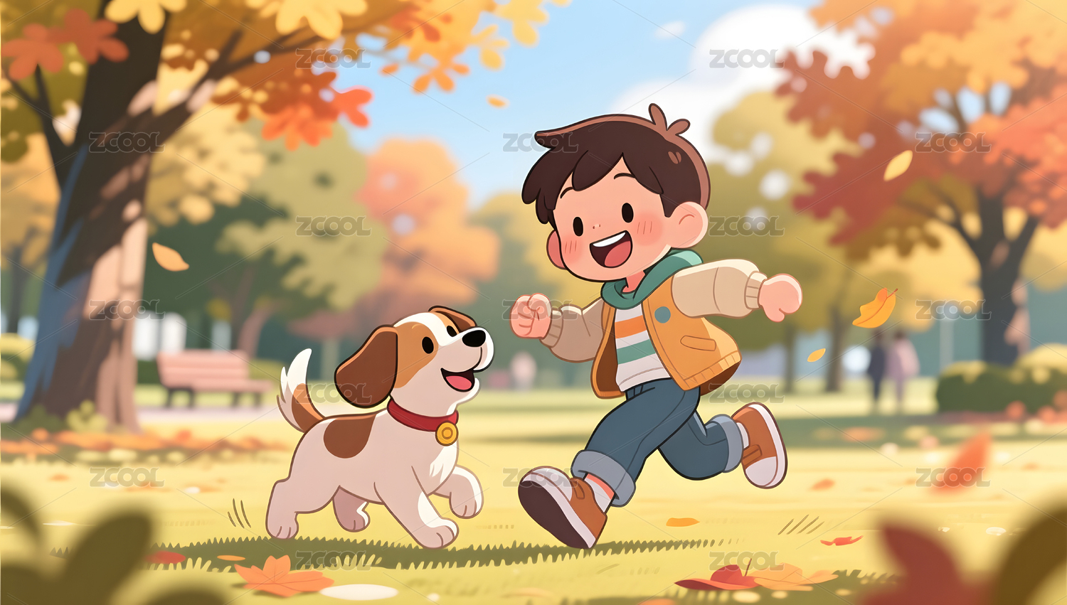 秋日公园男孩与狗的欢乐时光