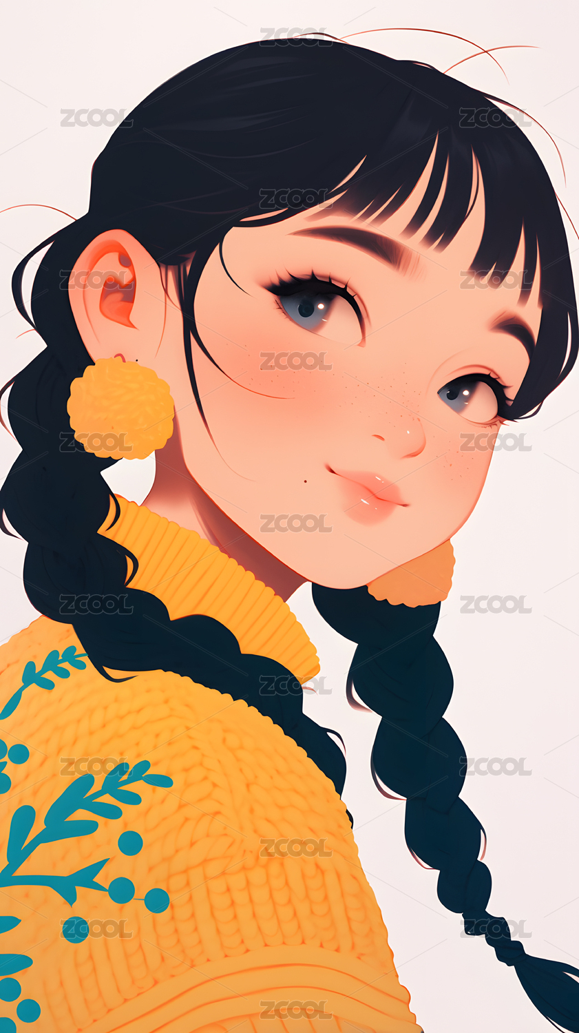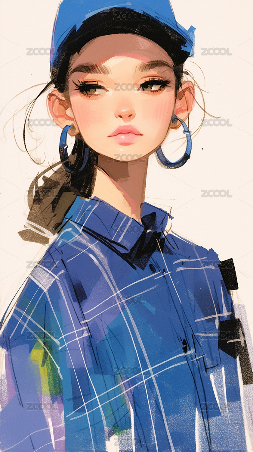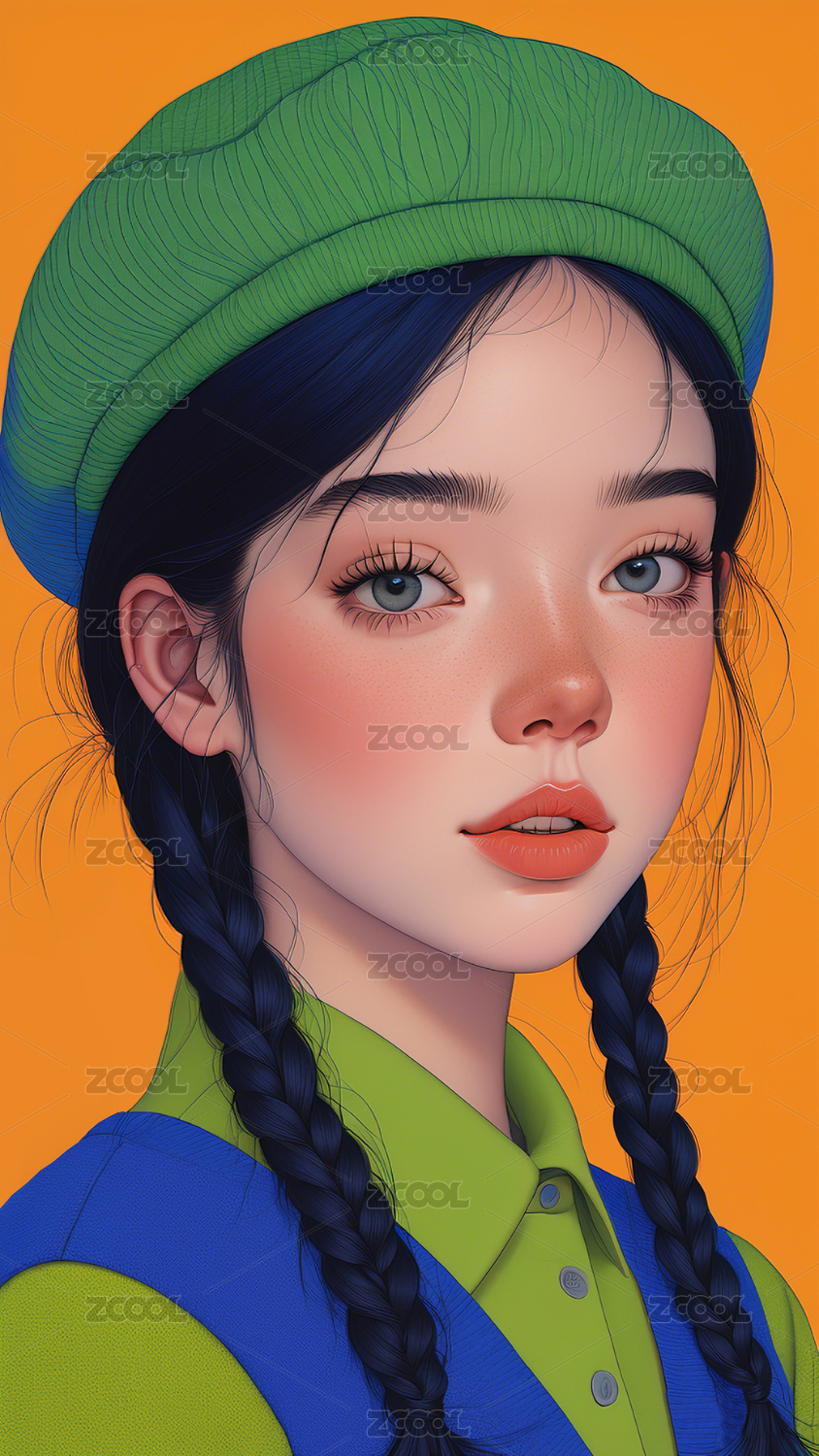 女孩,画像,自画像,侧面,牛仔,贝雷帽,绿色,条纹,衬衫,麻花辫