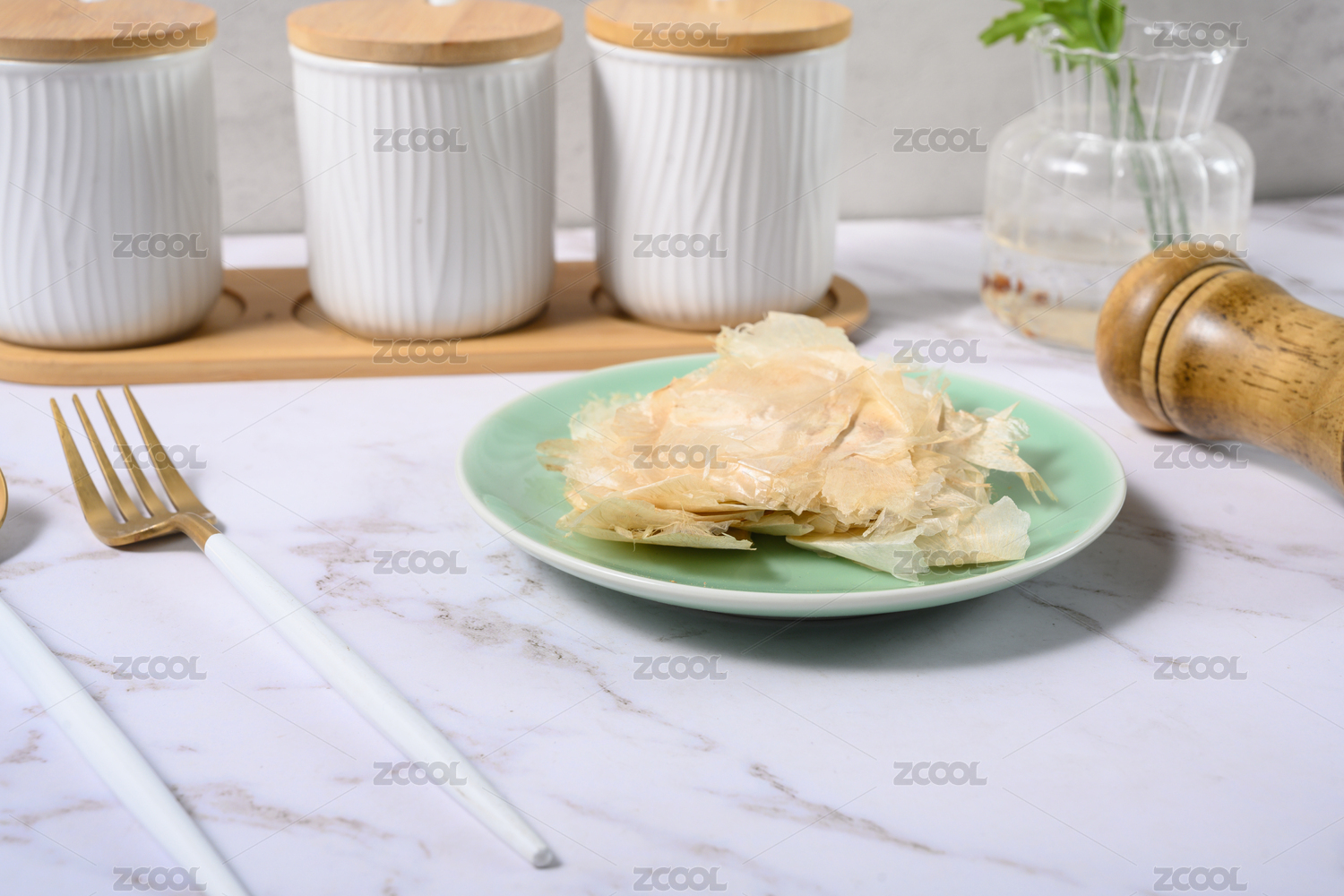 桌面上的盘子里的美味可口的腐竹