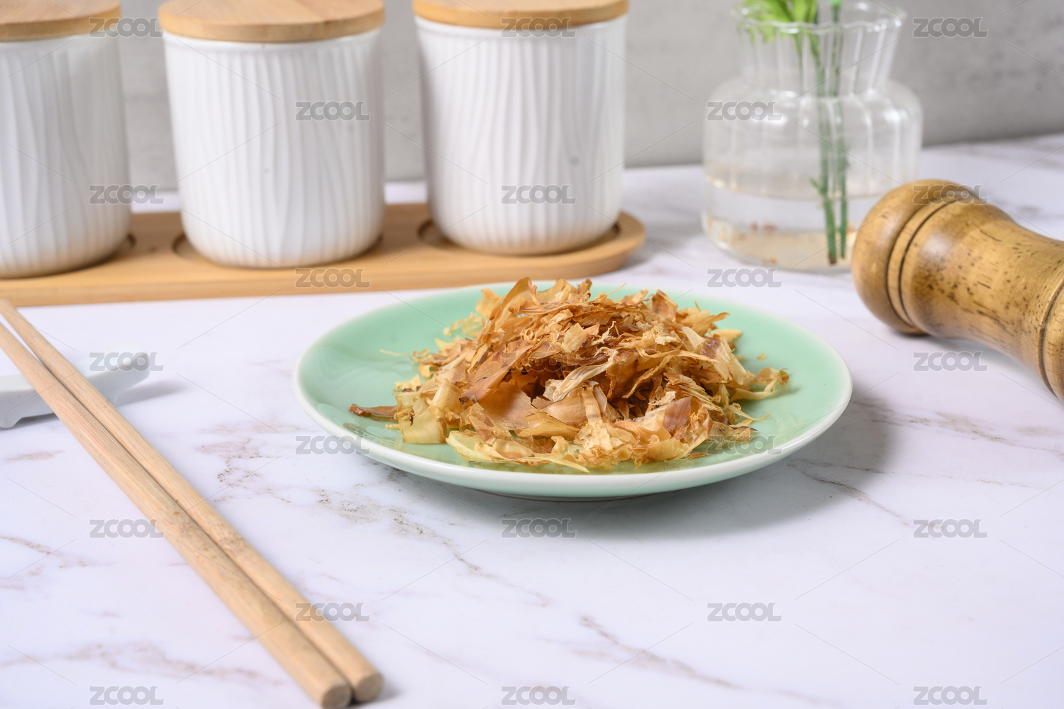桌面上的盘子里的美味可口的木鱼片