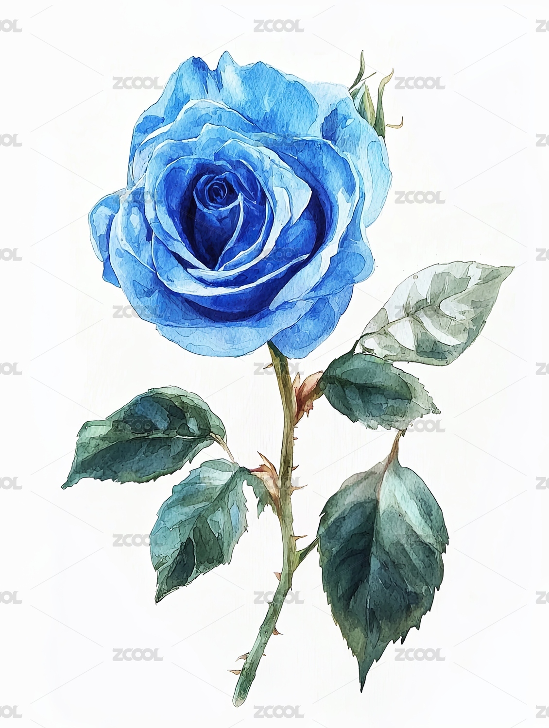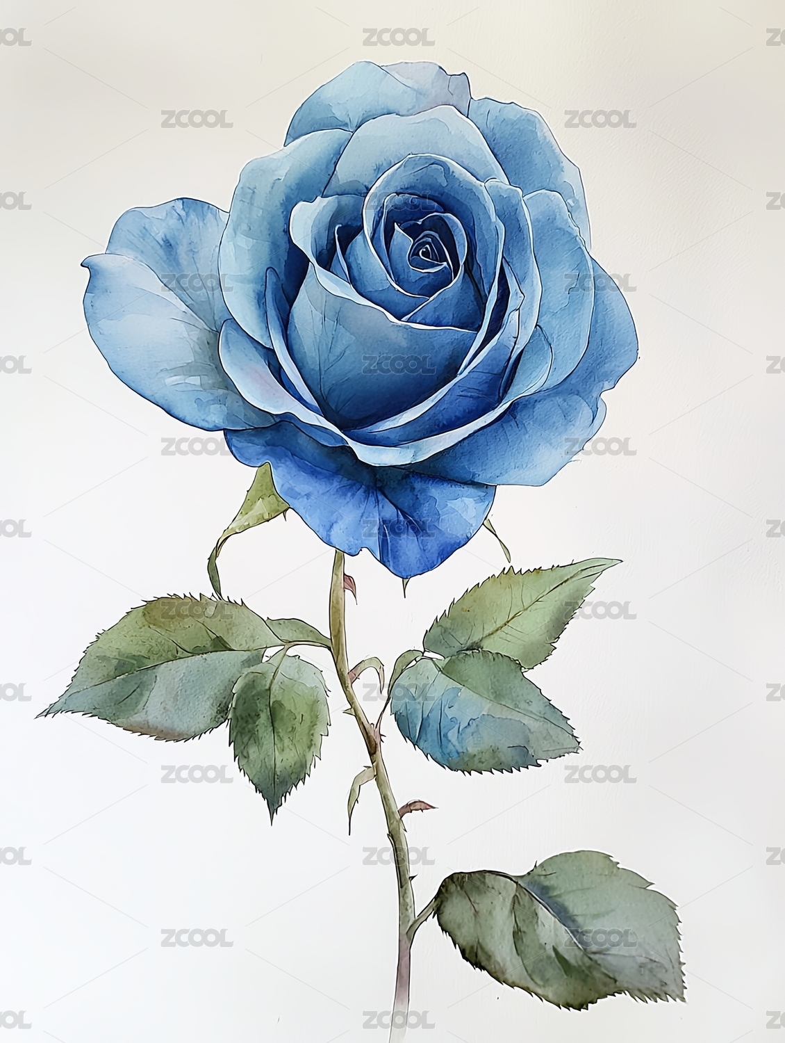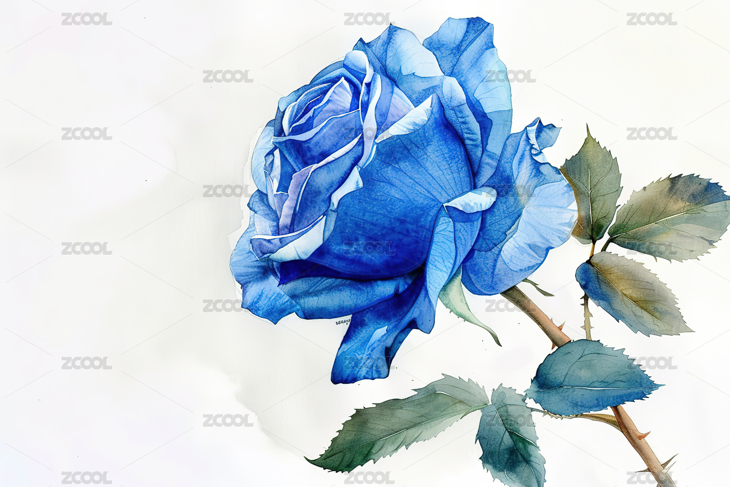 淡墨手绘水彩蓝玫瑰,纯色背景花卉素材插图