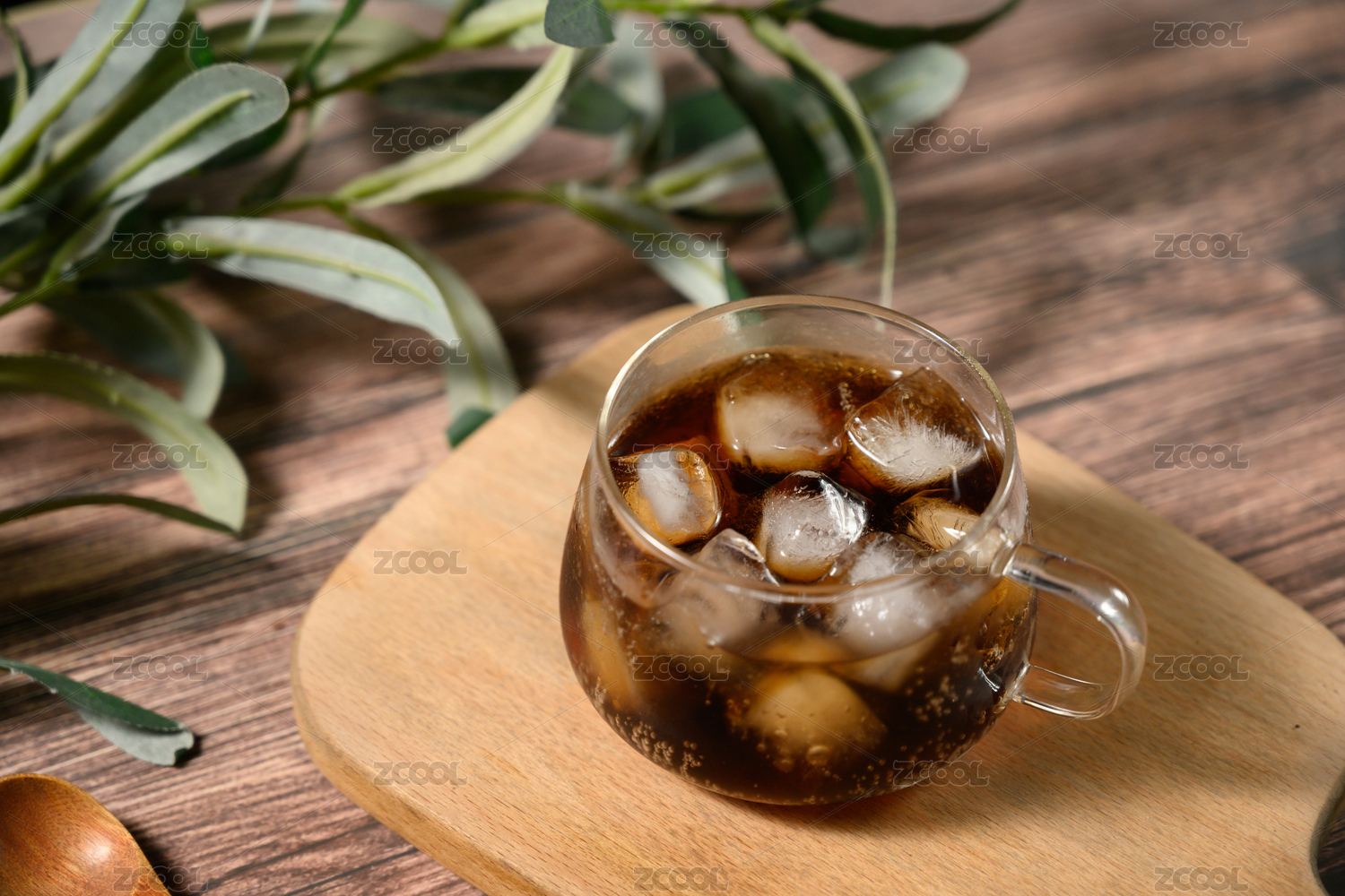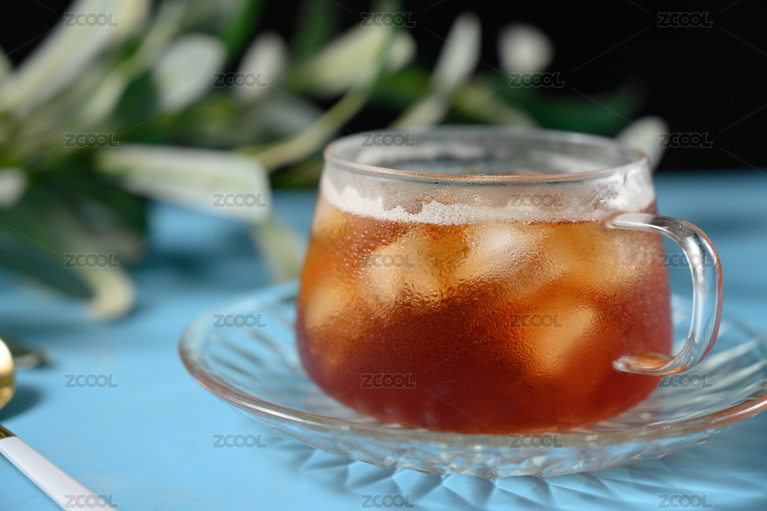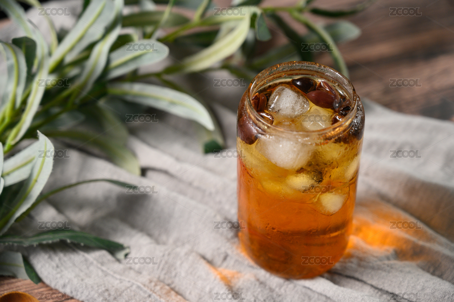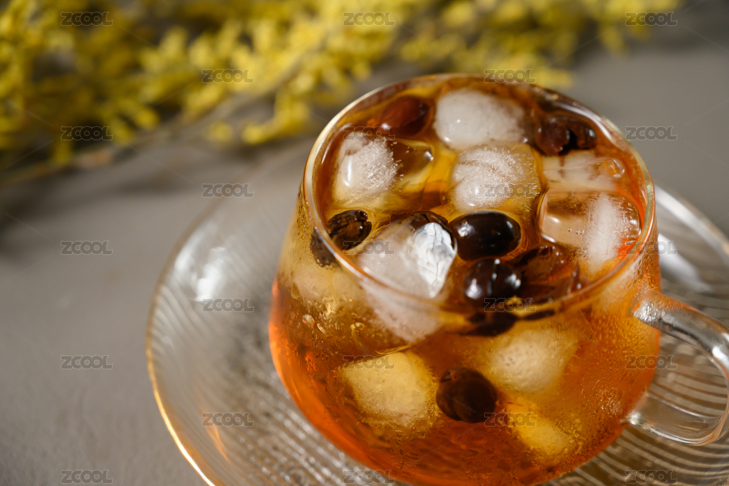 桌面上的杯子里的甘甜可口的冰咖啡果皮茶