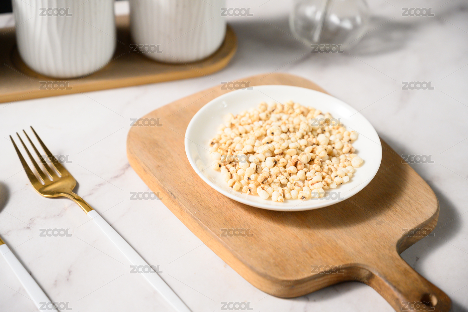 桌面上的盘子里的美味可口的炒薏苡仁