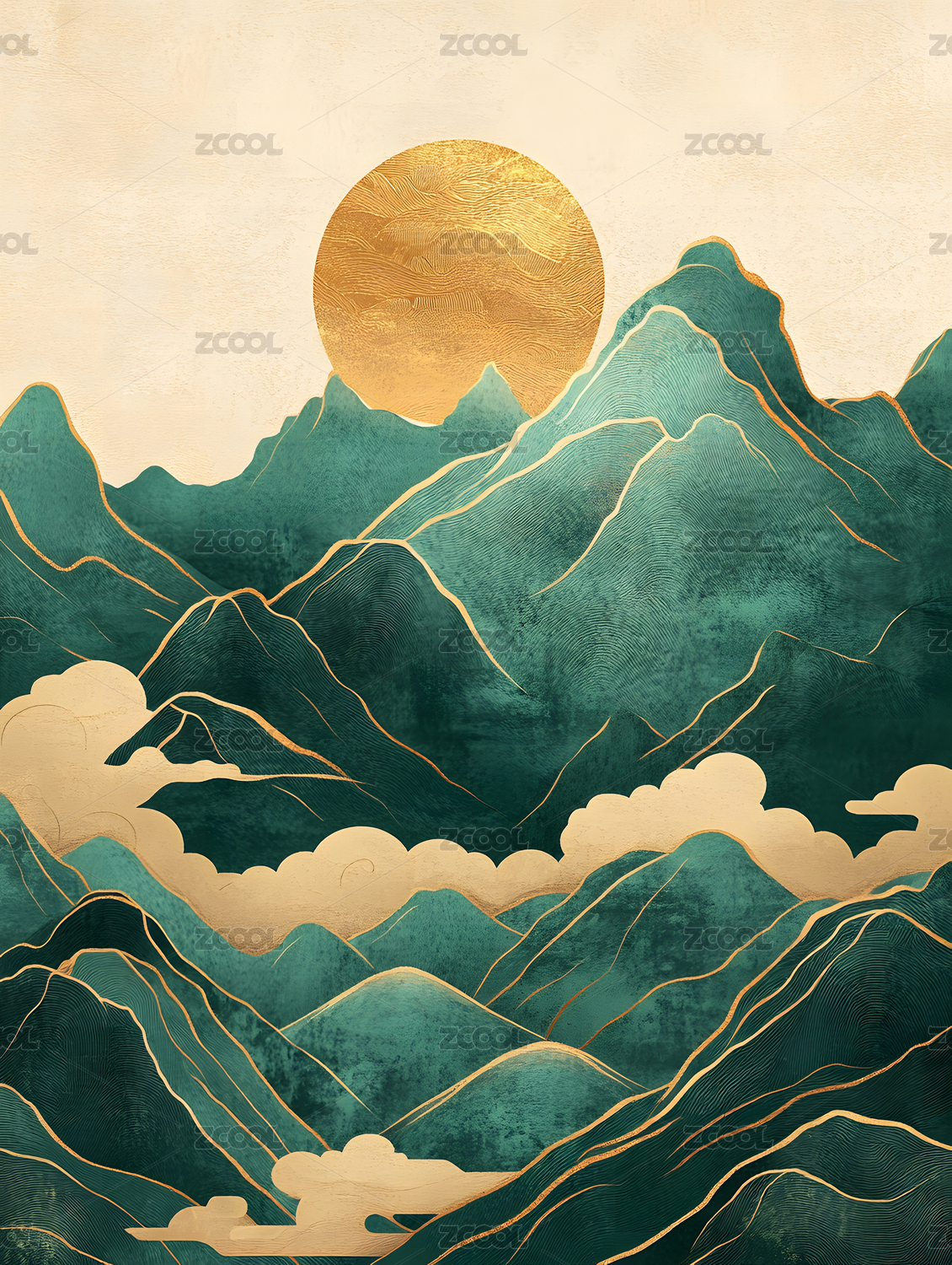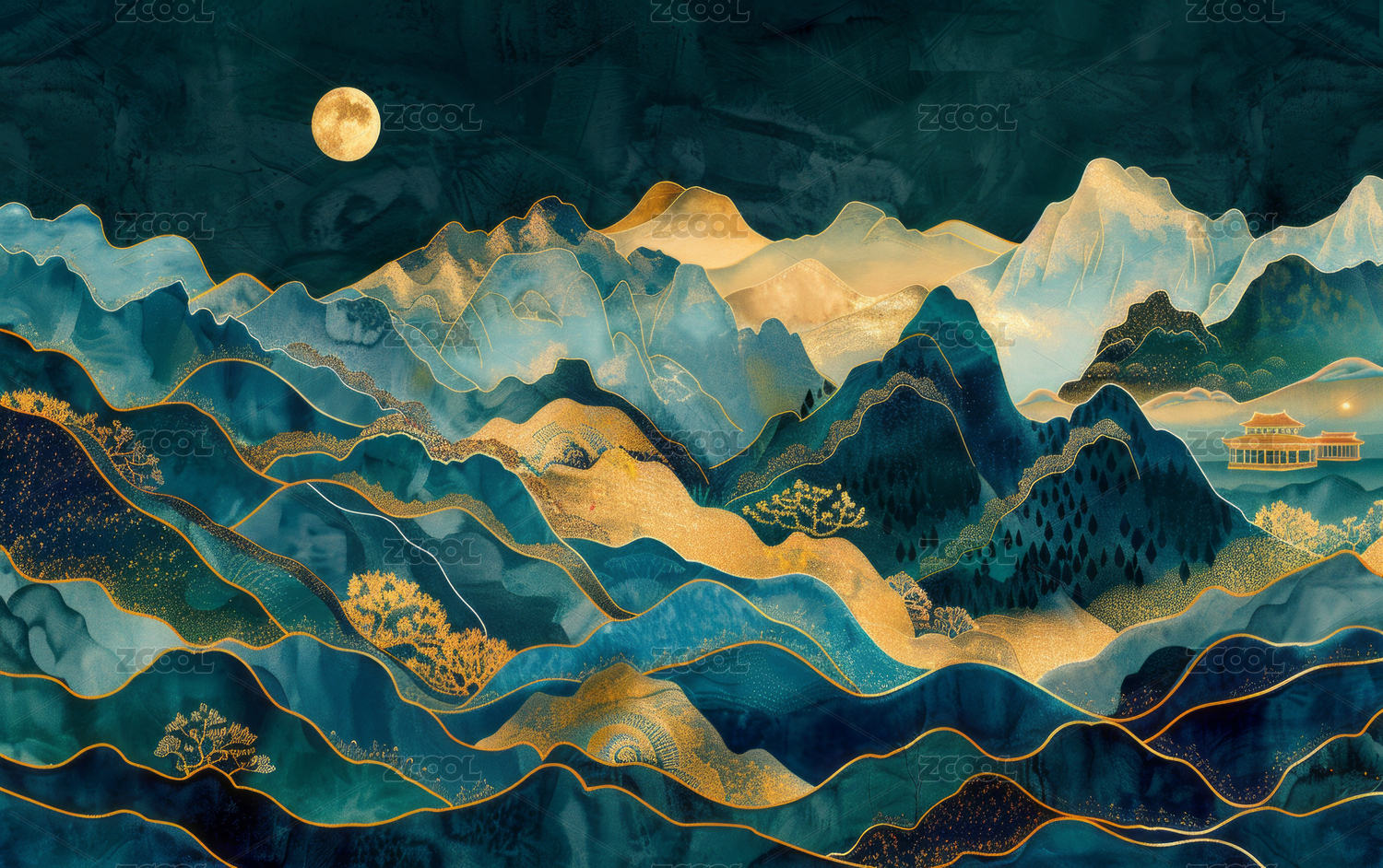 中国风黑绿金色壁画山石云海水墨背景壁纸