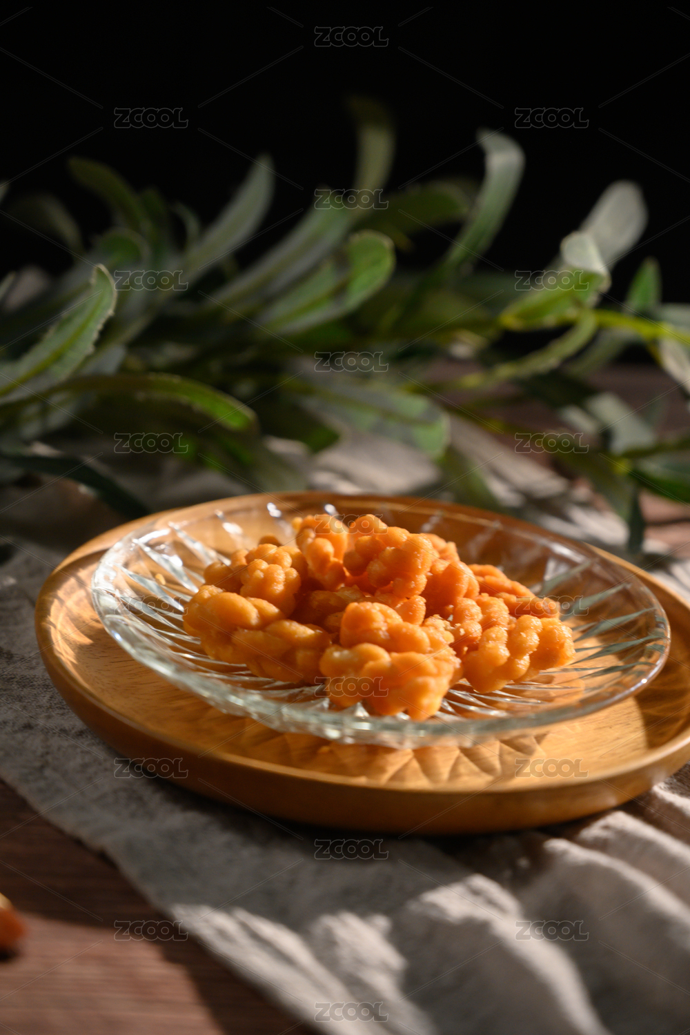 桌面上的盘子里的美味可口的糖麻花