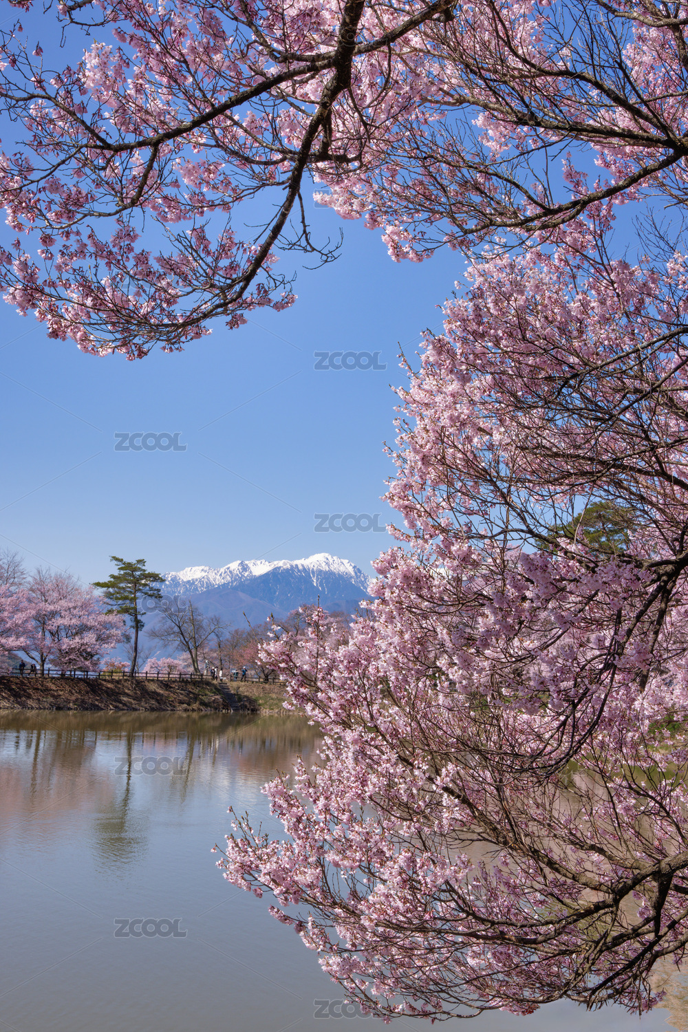 日本长野依那市六道堤雪山小彼岸樱花风光