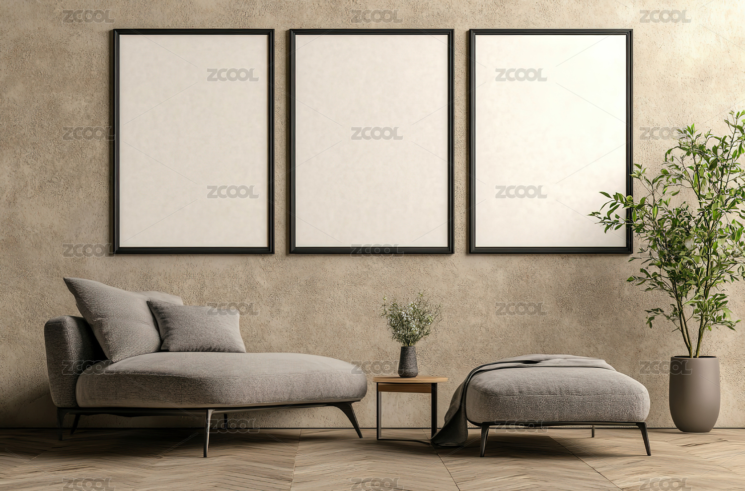 简约现代室内设计配有扶手椅和空白画框