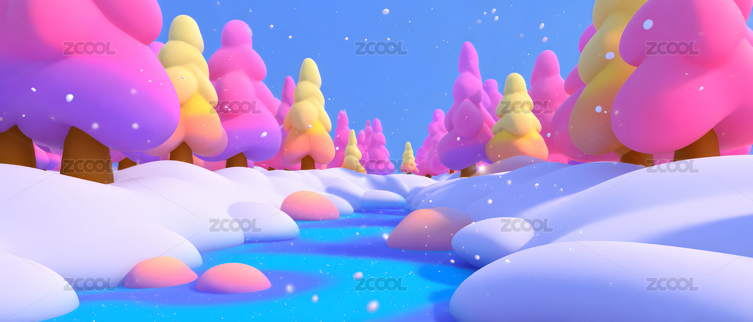 粉色蓝色树木与白色地形雪景三维卡通插画背