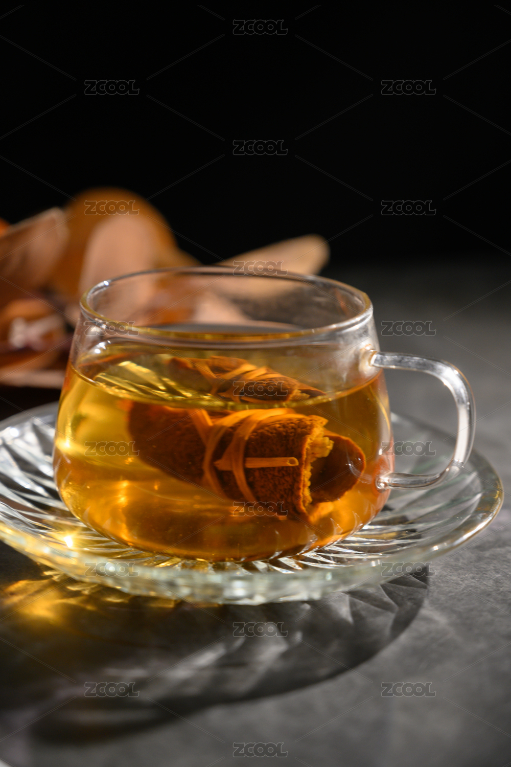 桌面上的盘子里的美味可口的陈皮三宝扎茶
