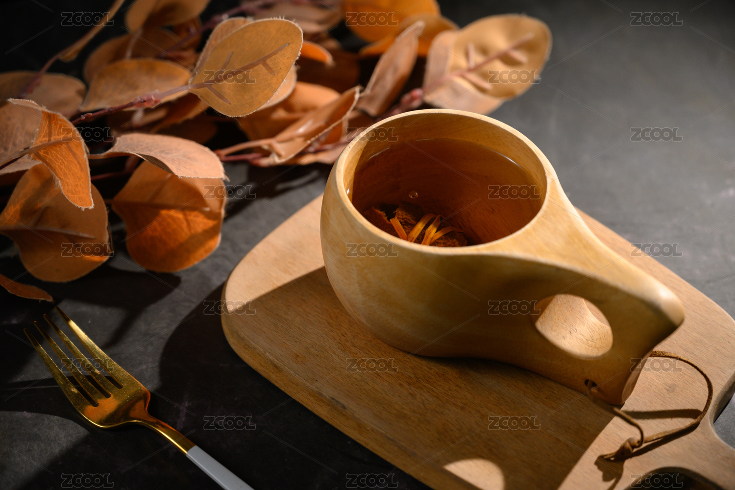 桌面上的盘子里的美味可口的咖啡果皮茶