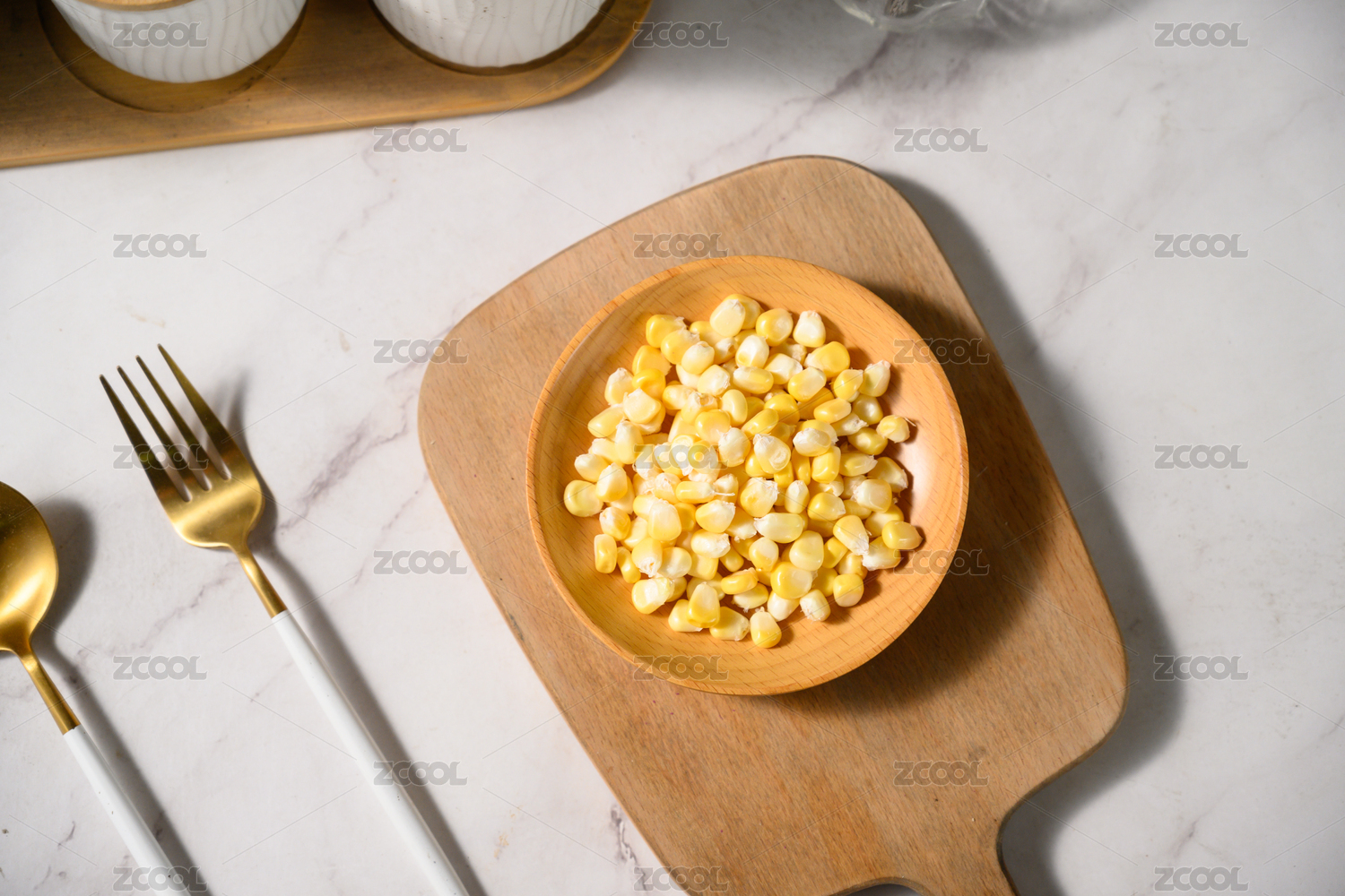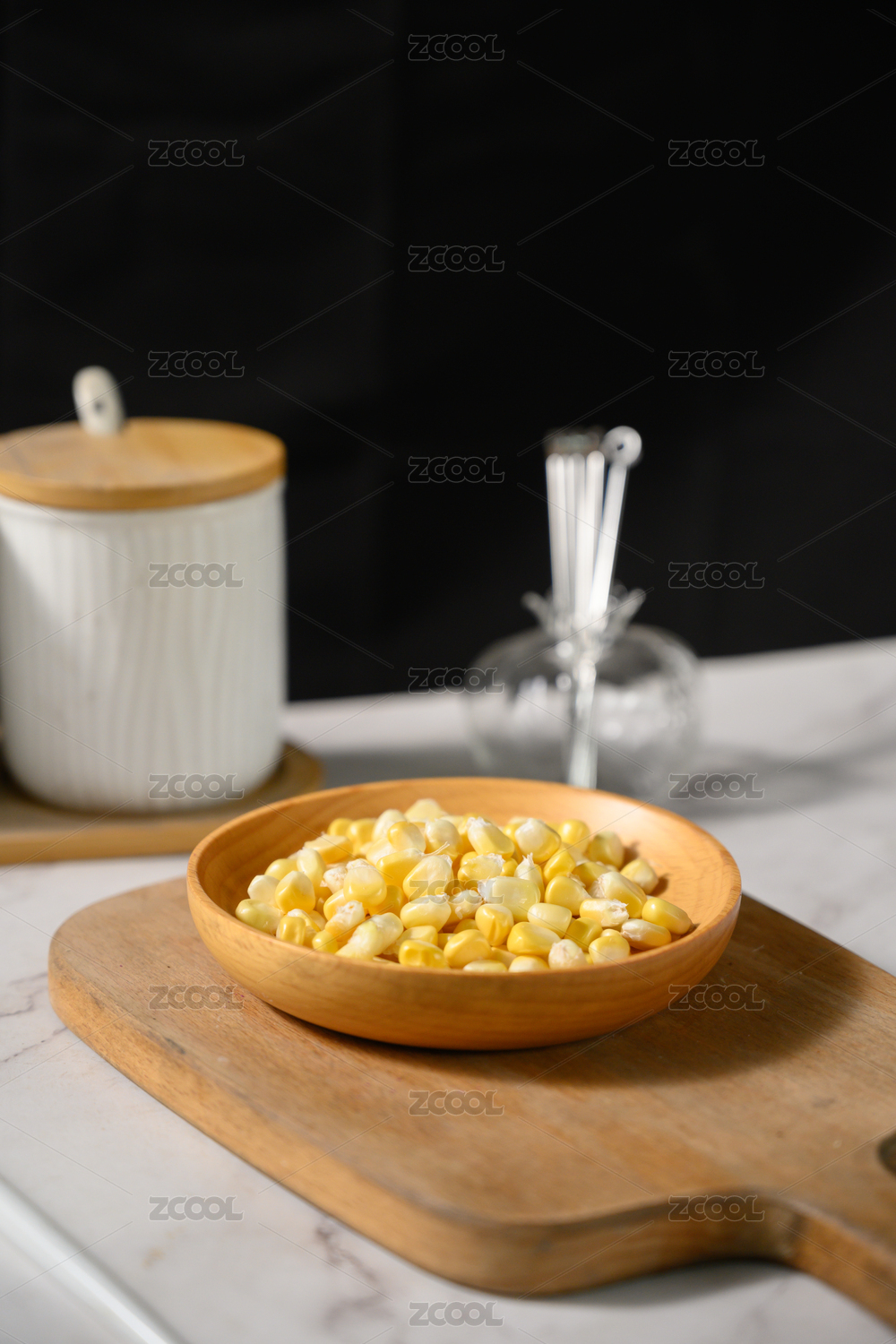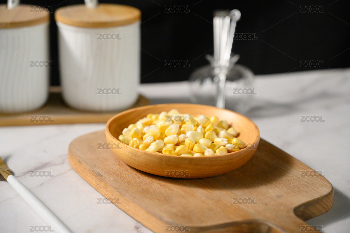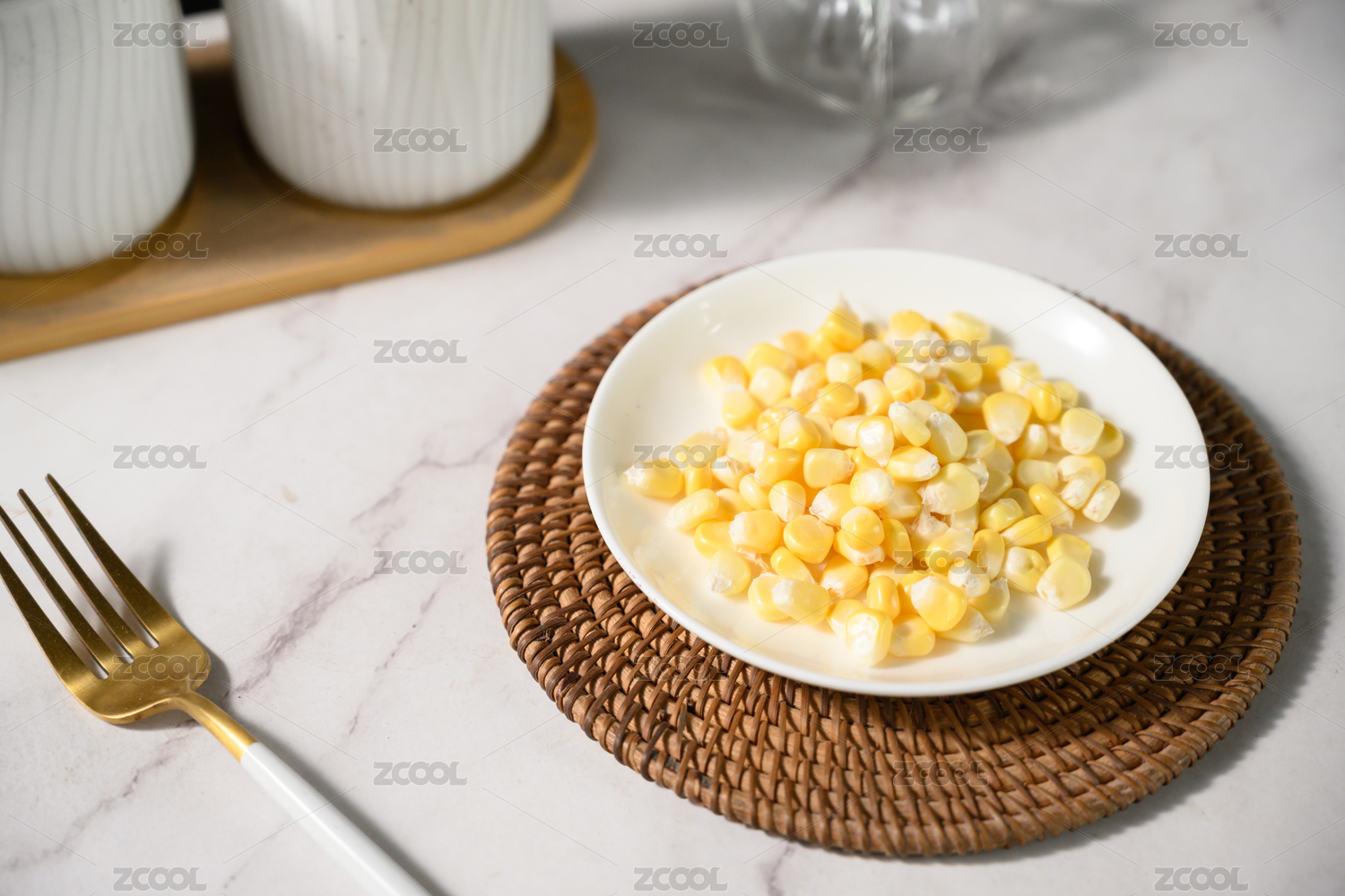 桌面上的盘子里的美味可口的新鲜玉米粒