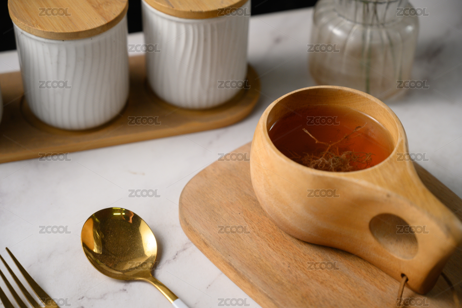 桌面上的杯子里的甘甜可口的金盏菊花茶