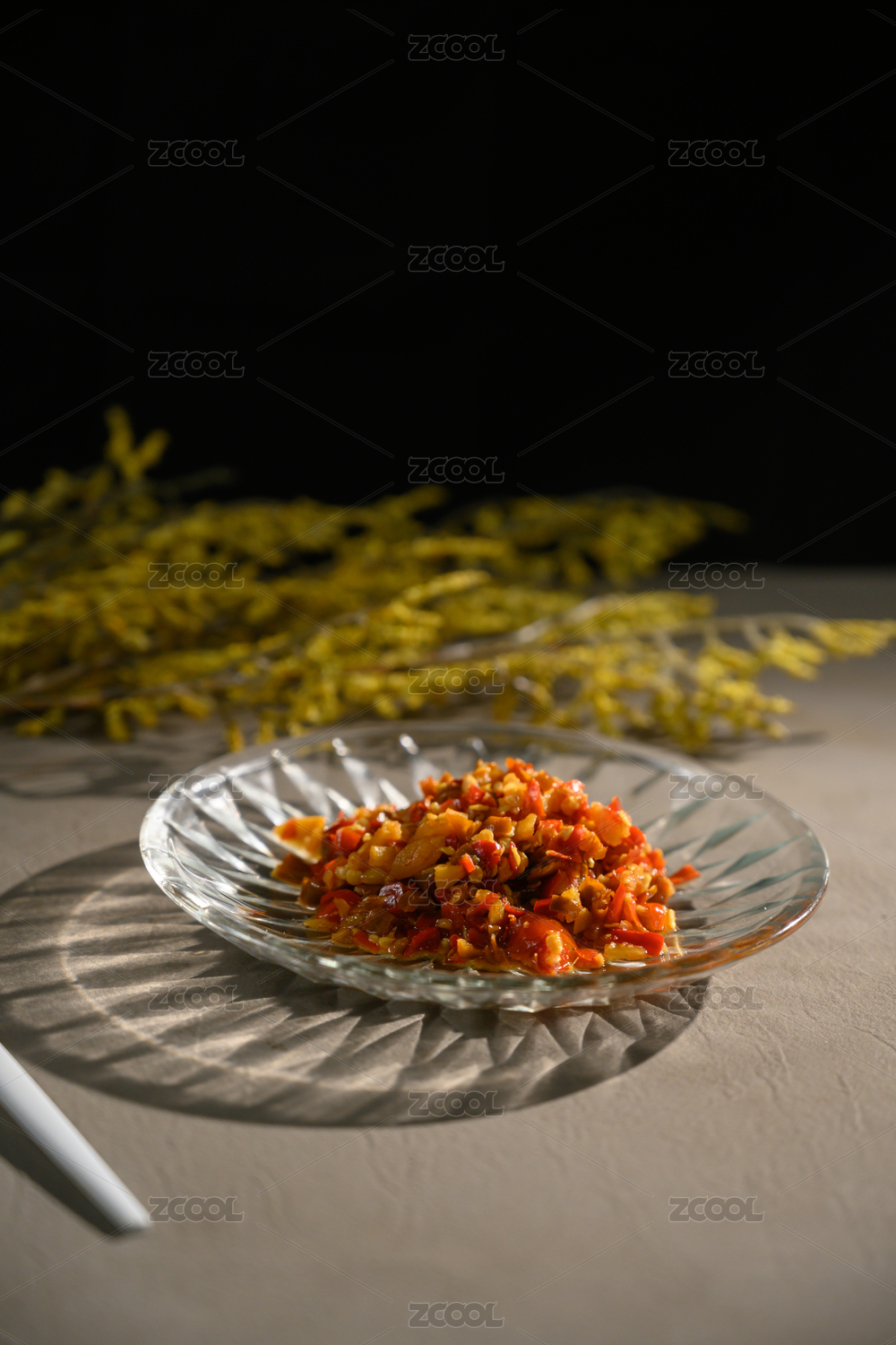 桌面上的盘子里的美味可口的青红剁椒