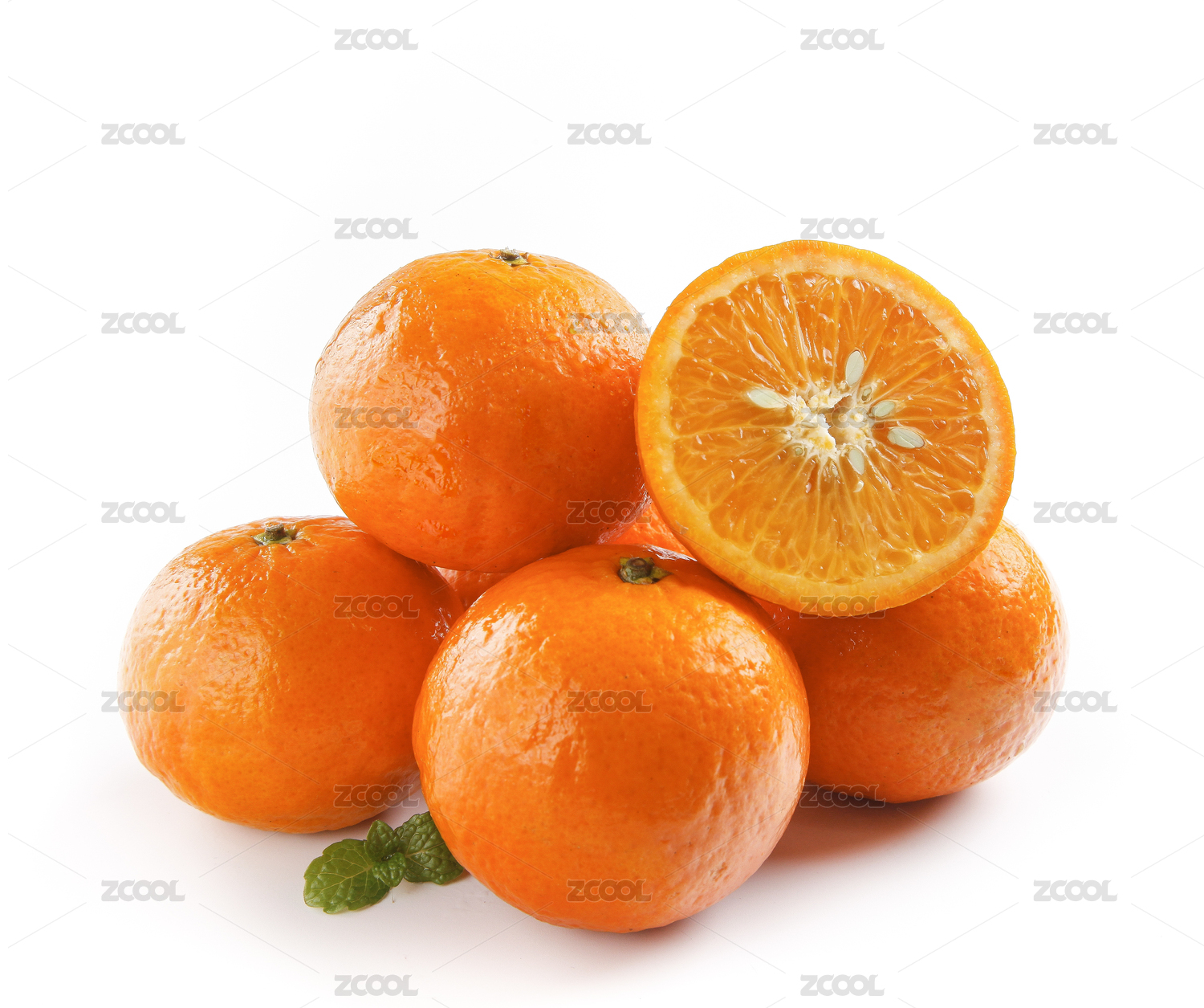 白底上放着一堆沃柑和切面的蜜橘