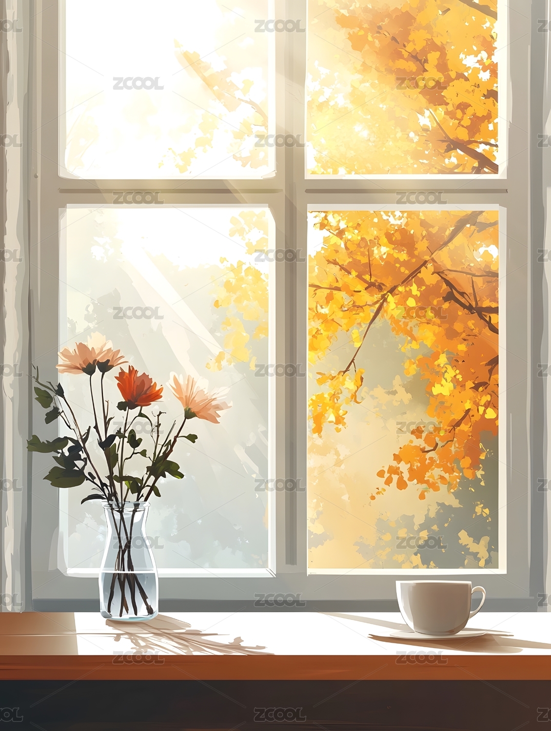 秋日窗台的温暖茶时光