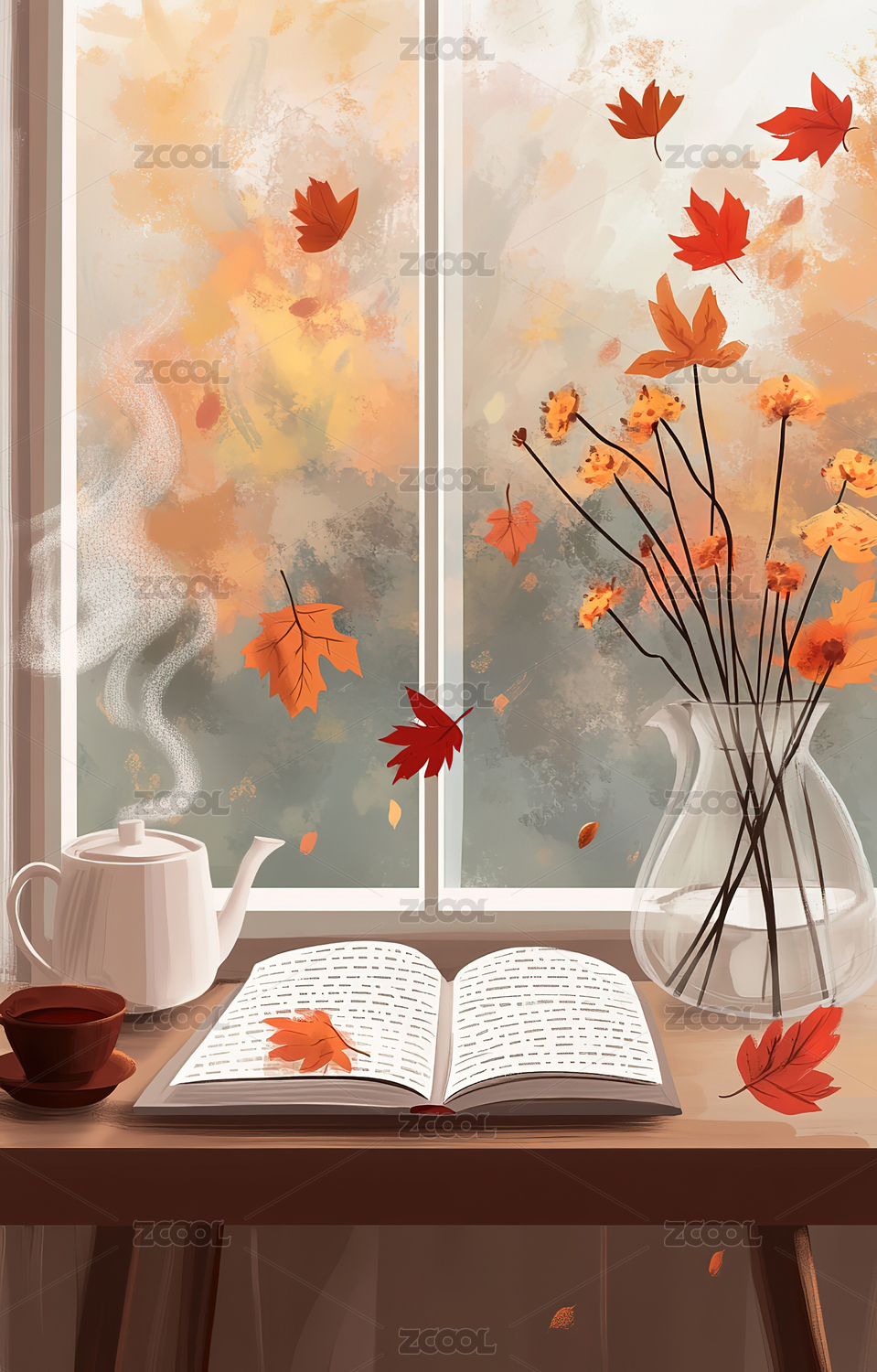 咖啡书籍落叶秋天主题插画