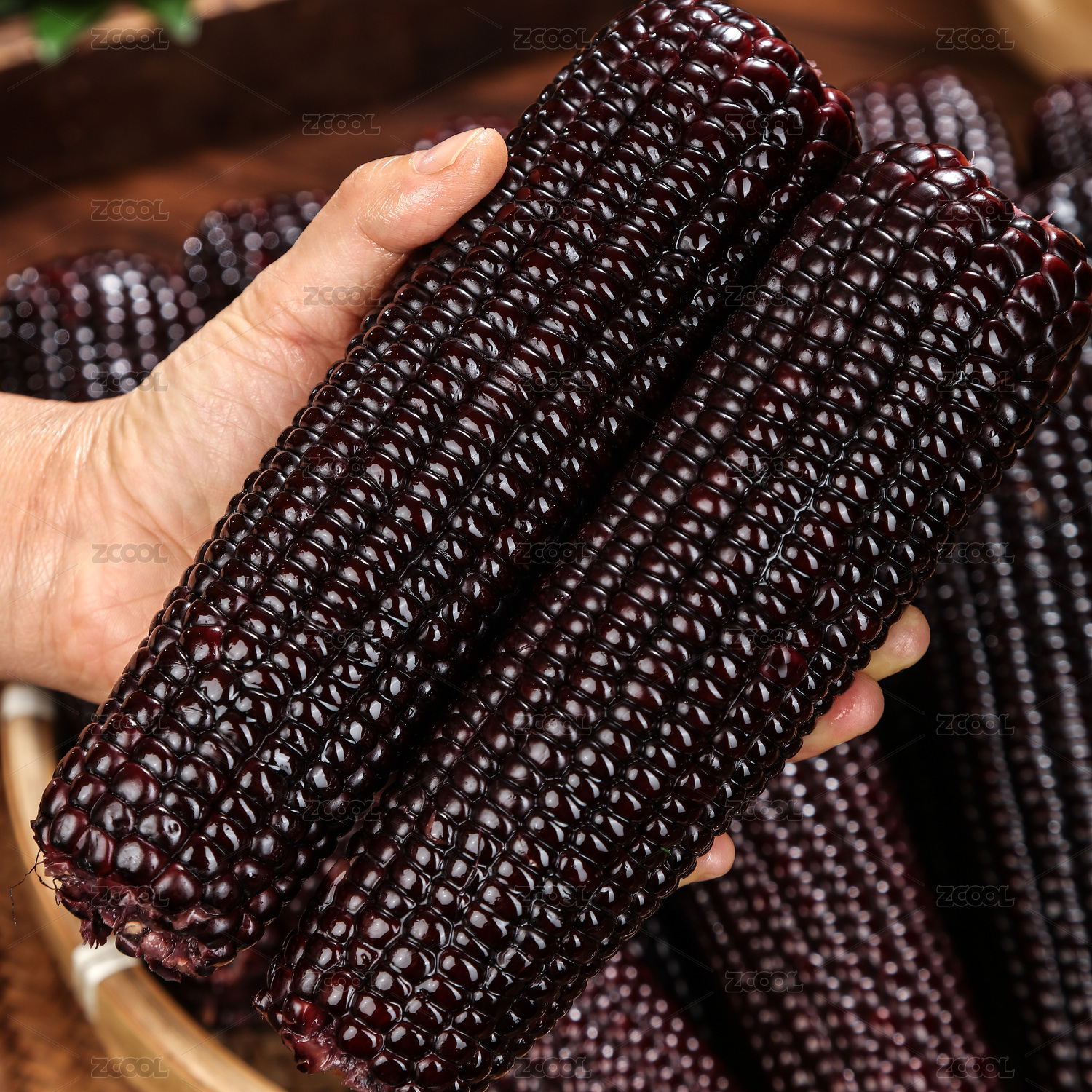 双手捧着一篮黑玉米棒