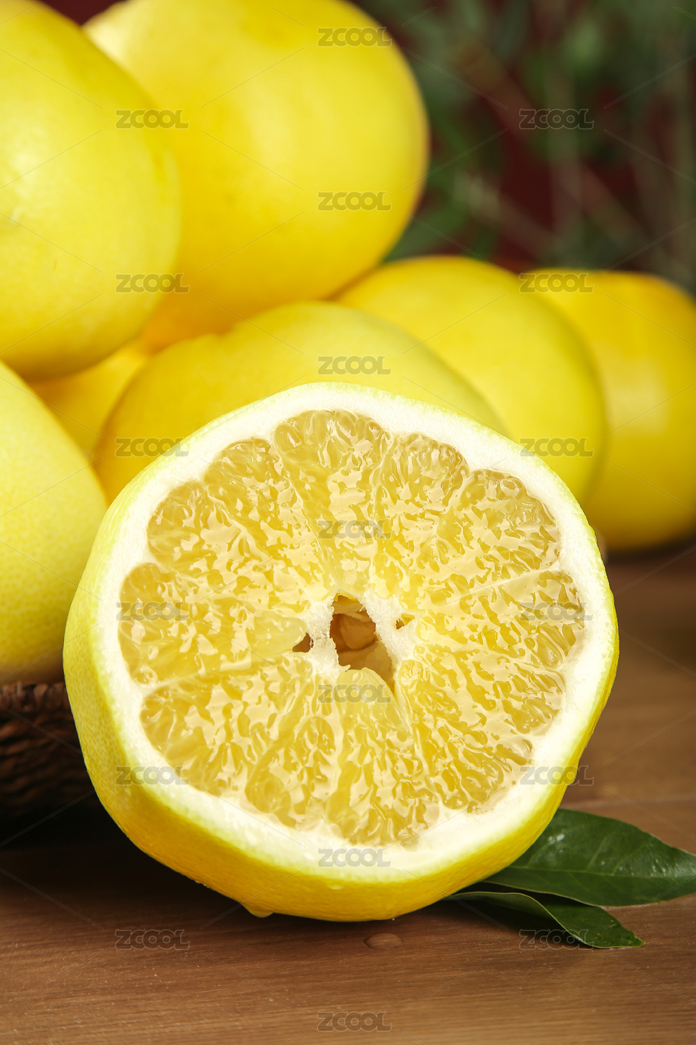 深底上放着一个完整的青柚和切面的葡萄柚