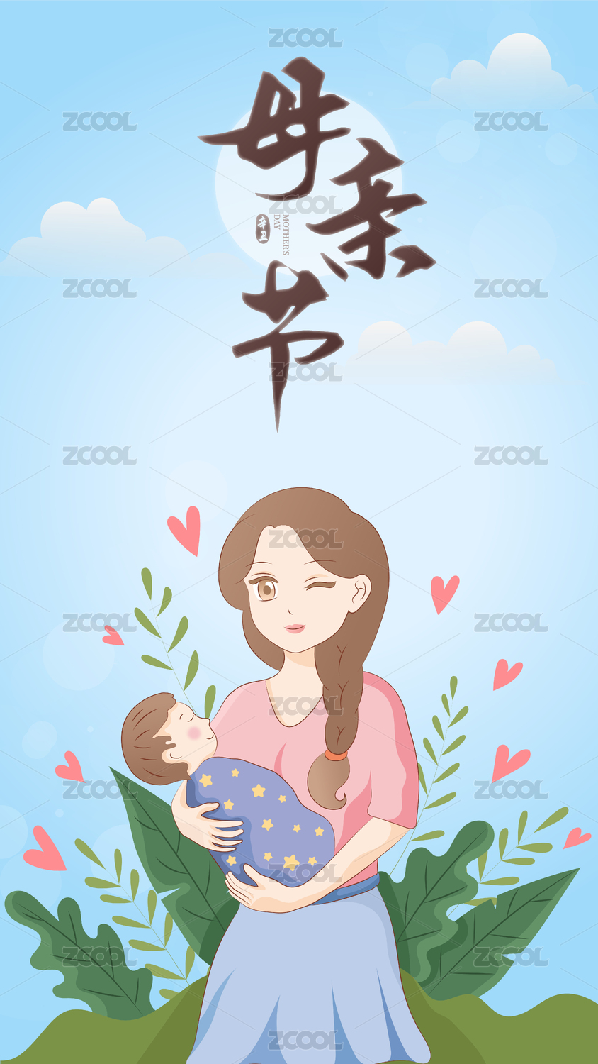 妈妈抱着小孩眼里充满爱母亲节矢量插画海报