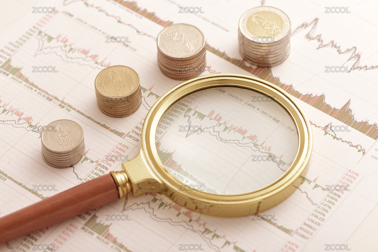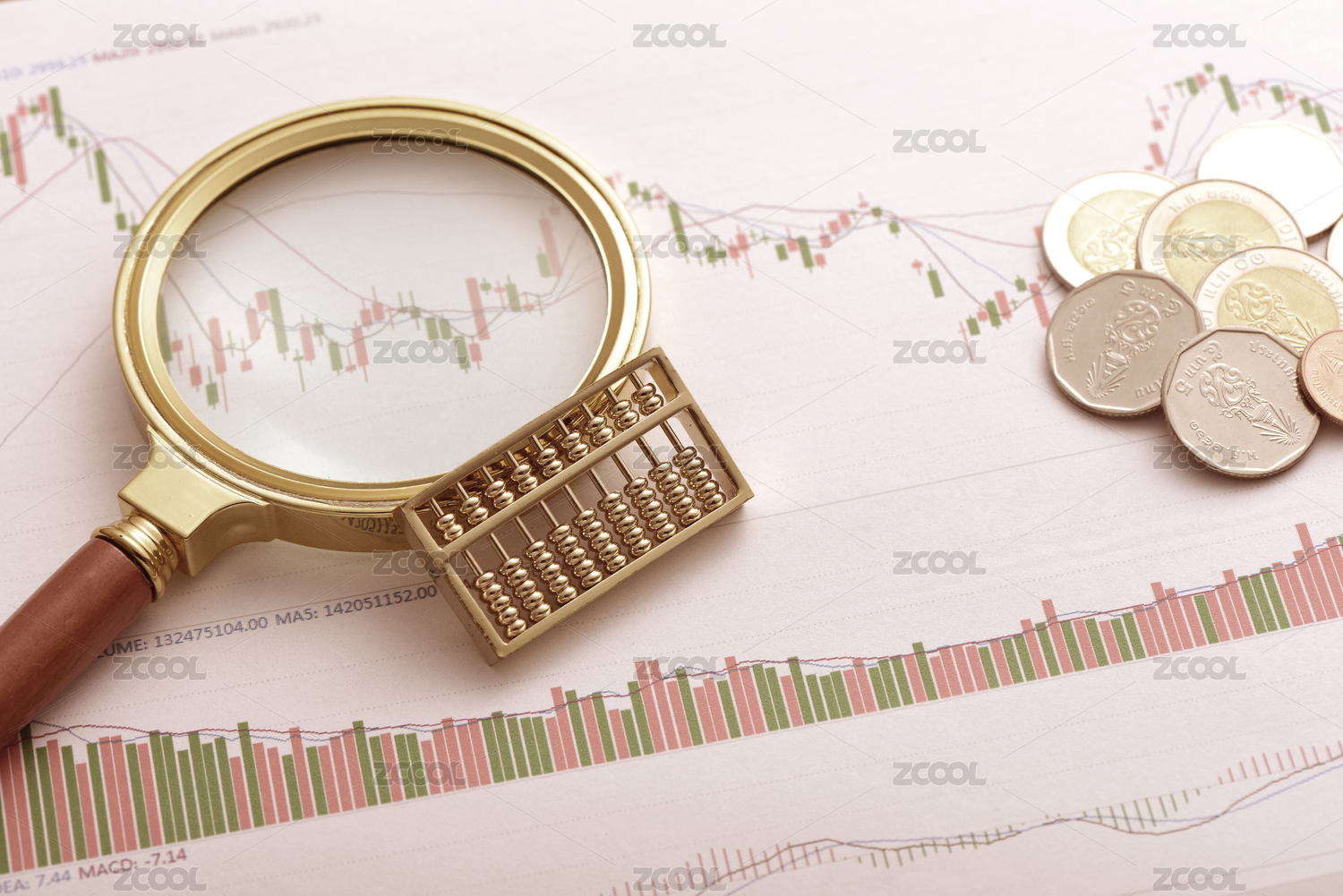 股市图表上放着放大镜、算盘和硬币