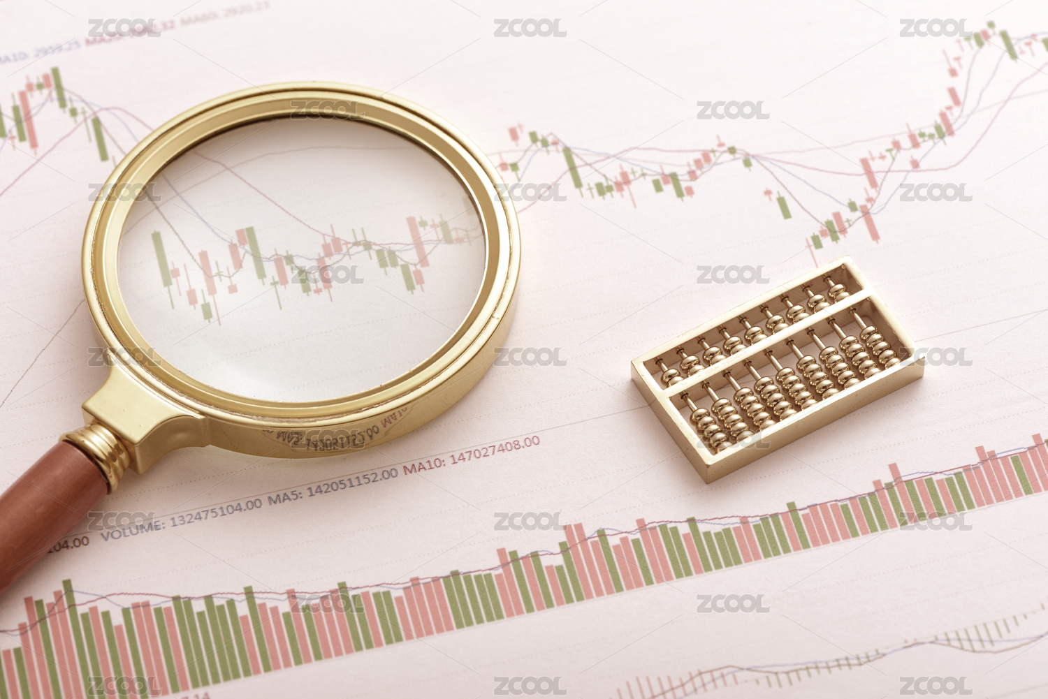 股市图表上放着放大镜和算盘