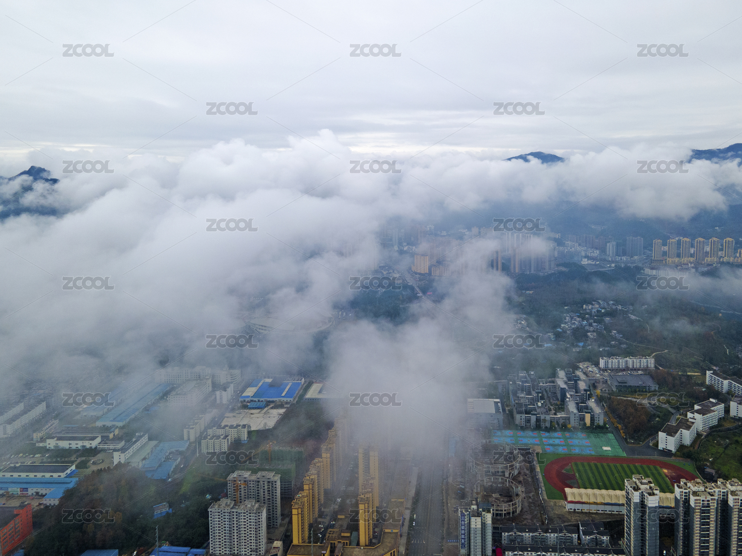 贵州省遵义市新蒲新区上空出现平流雾景观