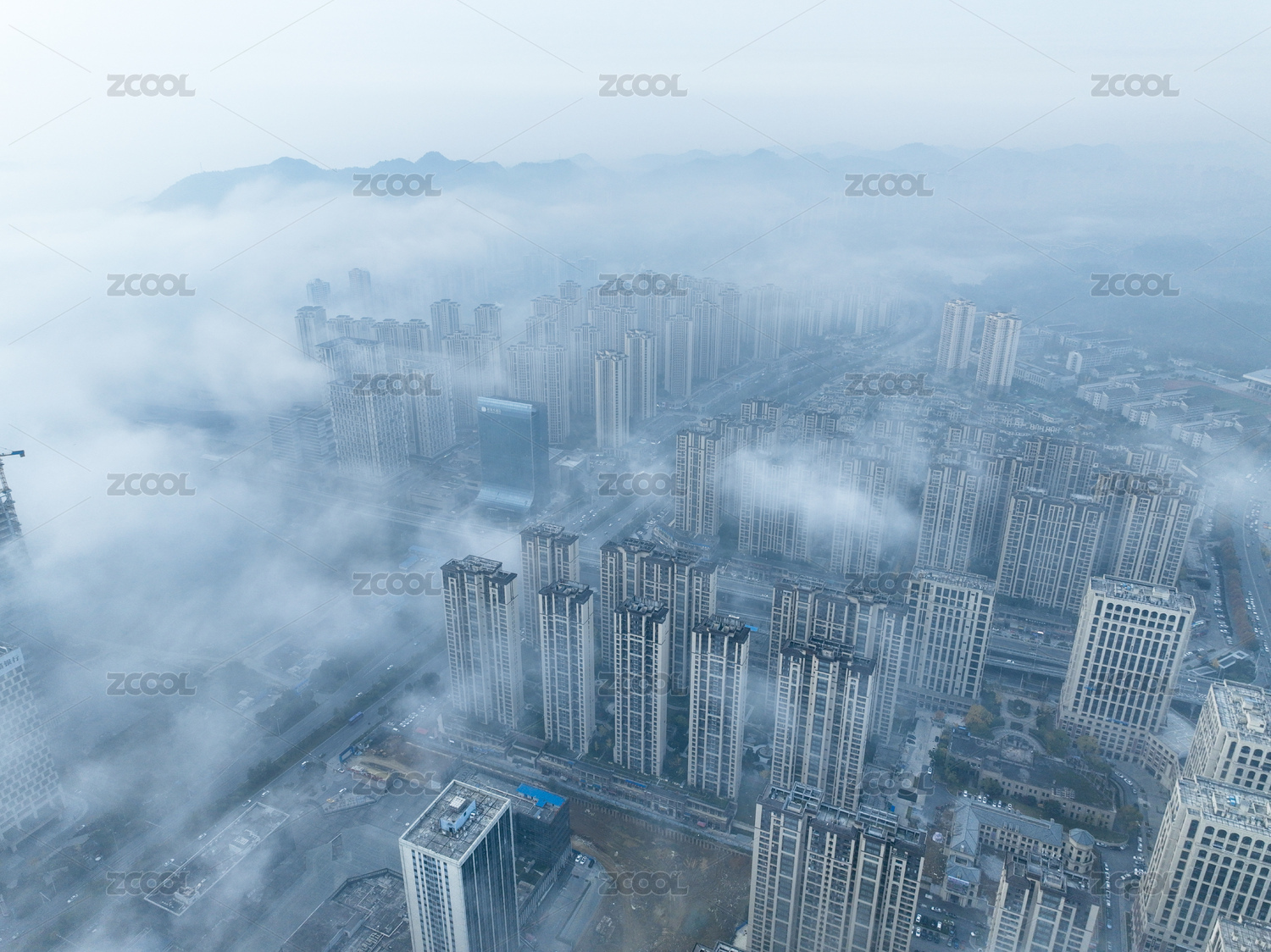 航拍春季清晨广西柳州市鹿寨县县城建筑雾景