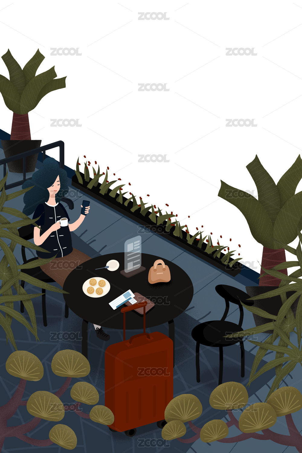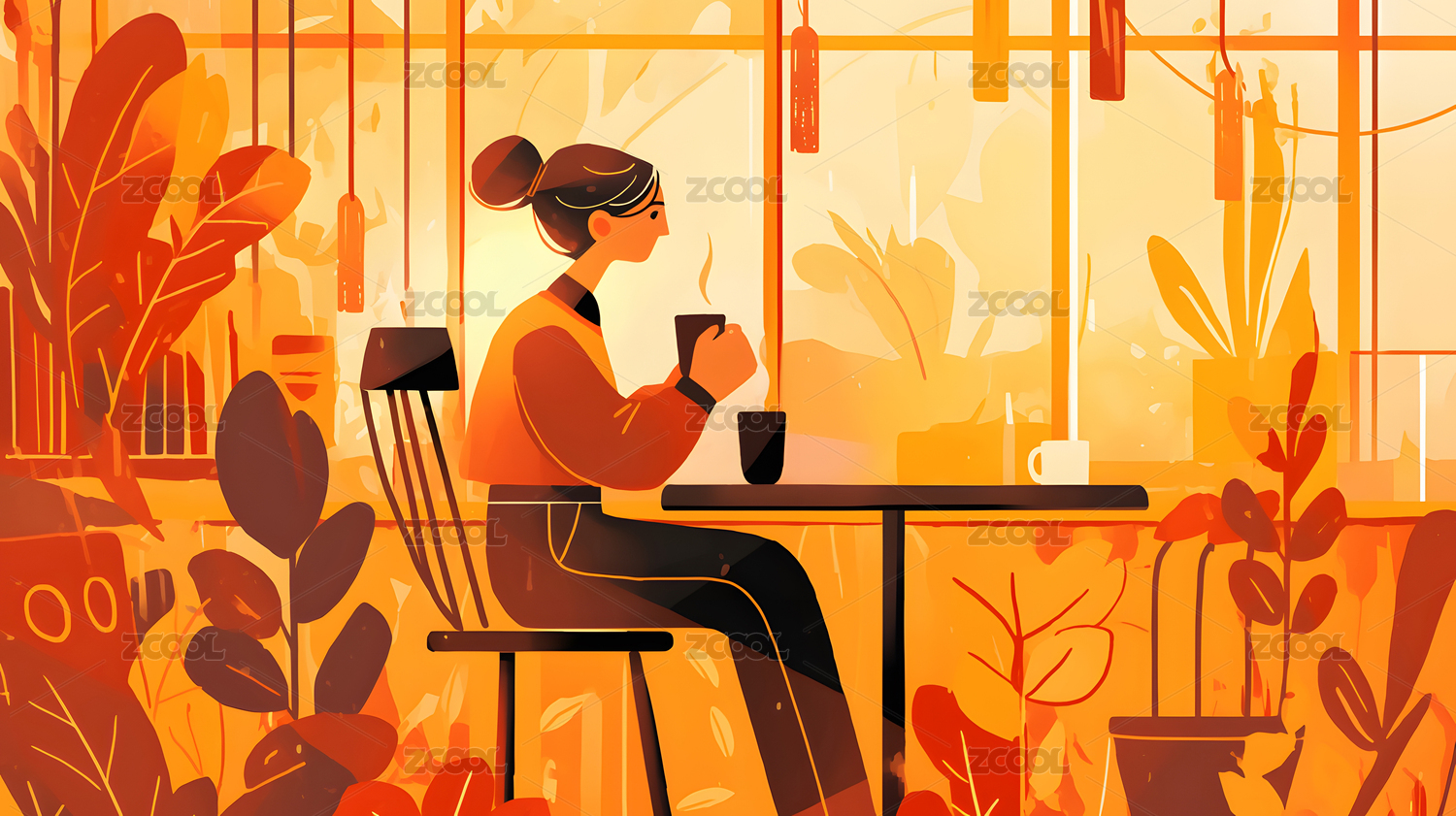 插画,女孩,人物,女生,手绘,下午茶,室内,植物,场景